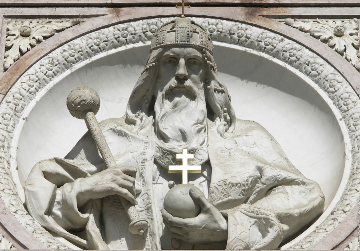 정면에 가로줄이 두 개인 십자가를 들고 근엄하게 서 있는 성 이슈트반의 동상이 제일 먼저 눈에 들어온다.