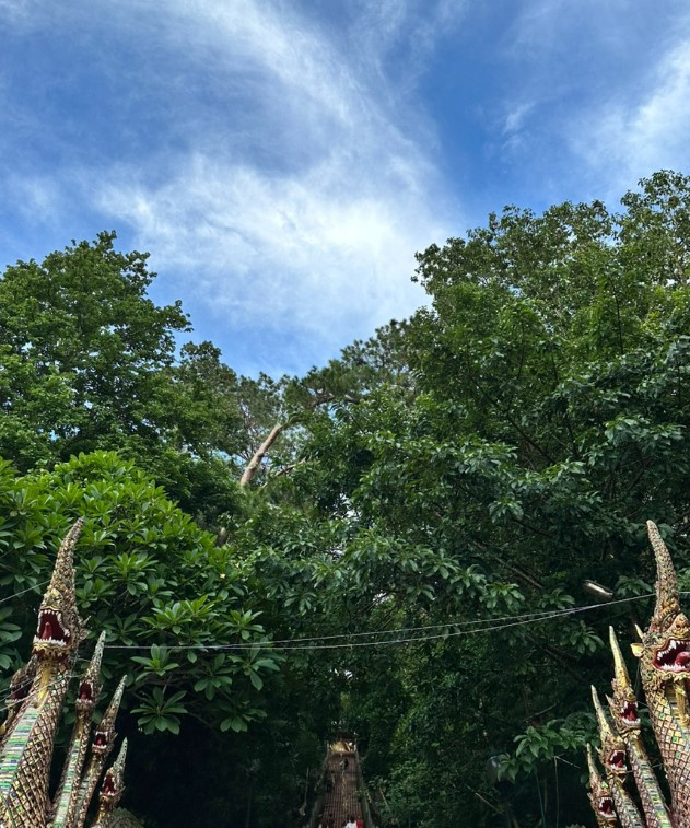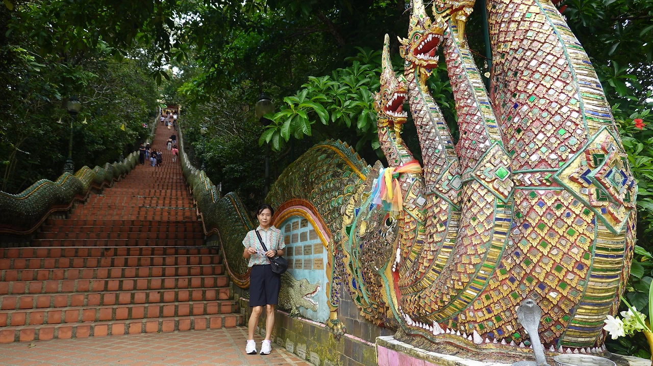 도이수텝 사원의 입구에는 나가(Naga)라고 하는 용처럼 보이는 상들이 입을 벌리고 입구를 지키고 있는데 계단 모양 역시 용의 모습처럼 굴곡져있다.