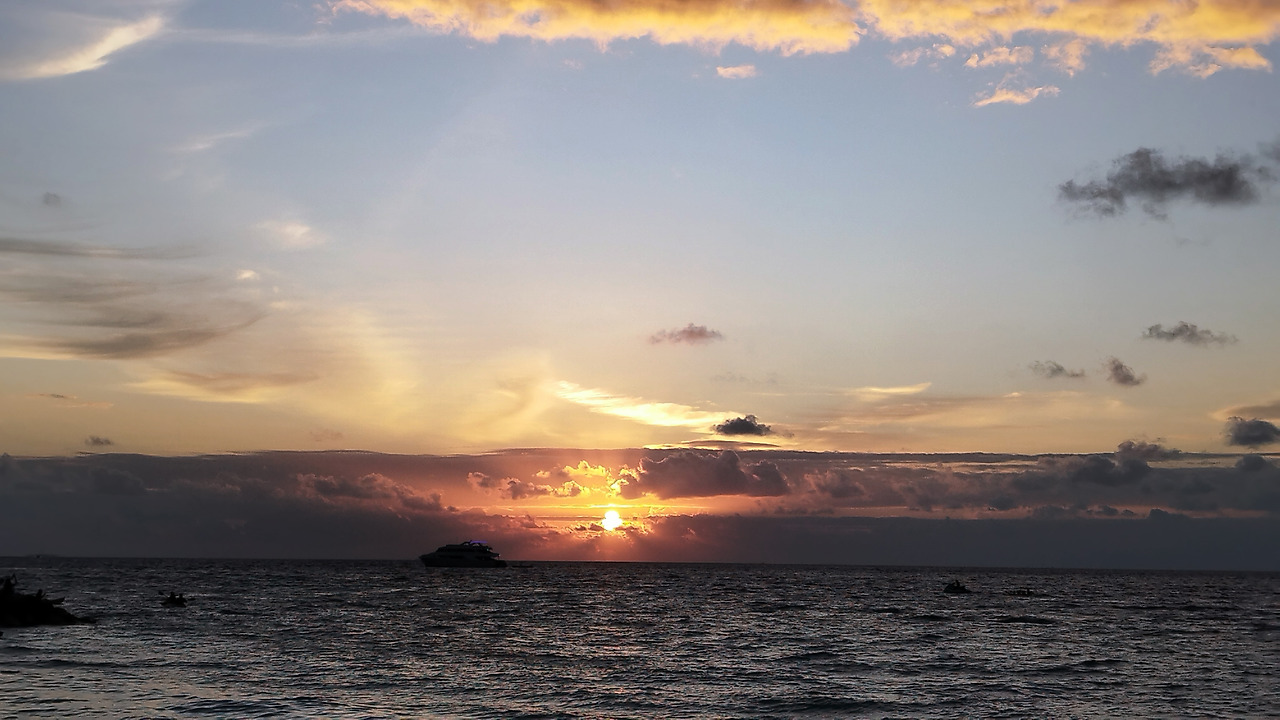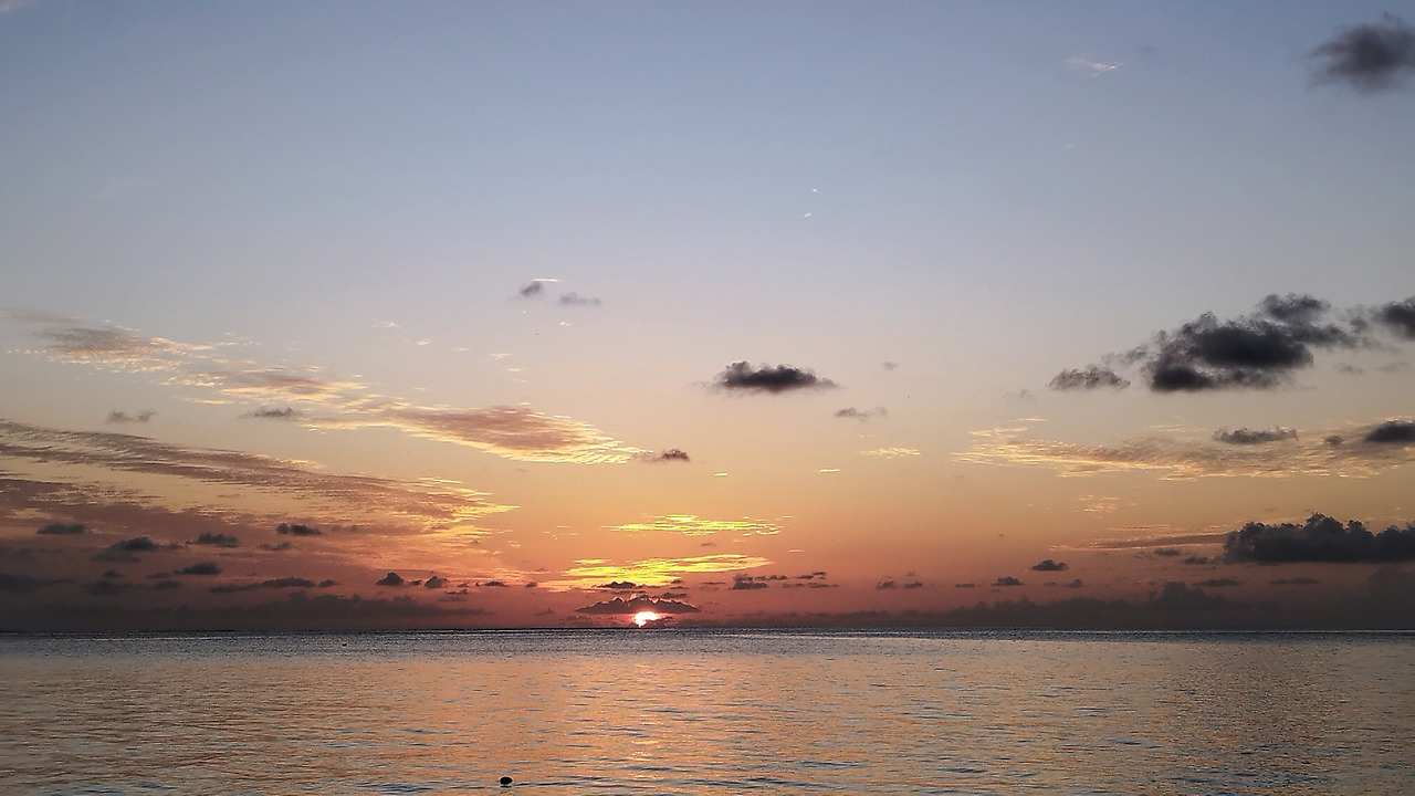형용할 수 없는 미묘한 색으로 하늘 전체를 물들이며 지는 해와 함께 조용한 바다에 나를 맡긴다.