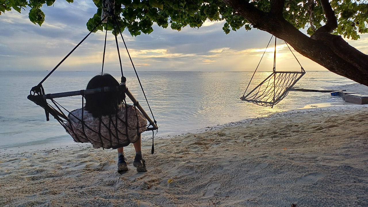독특하게 이 섬에는 나무에 매단 그물로 만들어진 의자들이 많다.