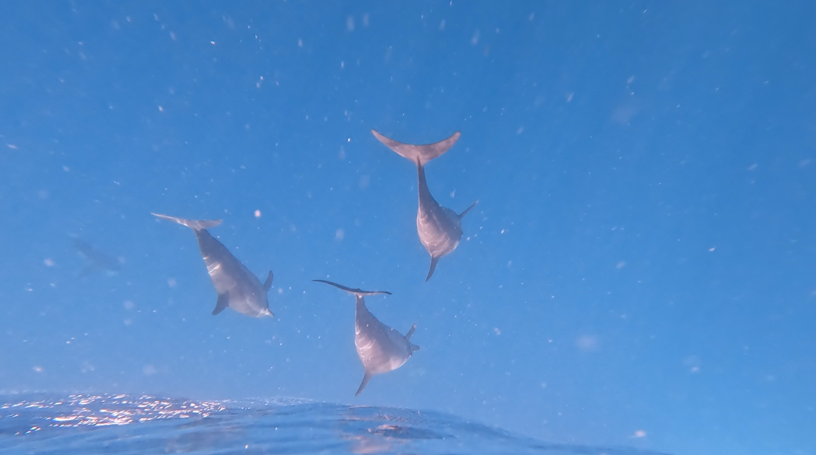 몇 년 전 필리핀 보홀에서도 돌고래를 구경하러 바다에 나갔지만 희미하게 아주 멀리서 헤엄치는 돌고래 몇 마리만 보고 돌아와야 했는데 지금 몰디브 바다에서는 나의 주변이 돌고래들 천지다.