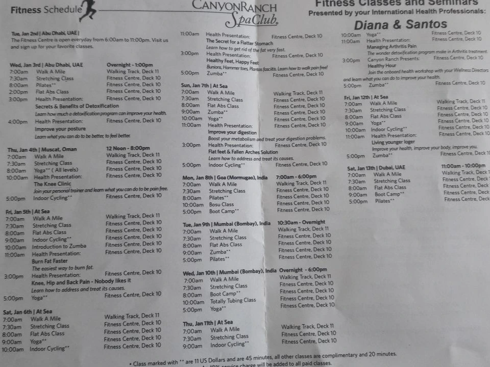 이 외에 운동을 할 수 있도록 다양한 기구가 갖추어져 있는 헬스센터와 내가 원하면 특정 수업도 받을 수 개인 수업을 위한 다양한 운동 프로그램도 있다. 난 호기심으로 요가 수업을 신청해서 수업을 받은 적이 있는데 미국인이 요가를 가르친다는 생각에 나의 선입견이 작용했는지 조금은 신뢰가 떨어지기도 했다. 하지만 선상생활을 하면서 불어나는 내 살들을 정리하는데 도움이 된 건 사실이다.