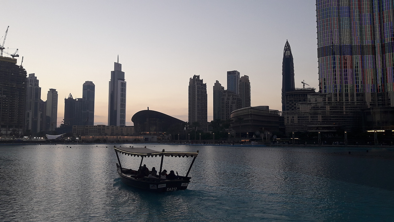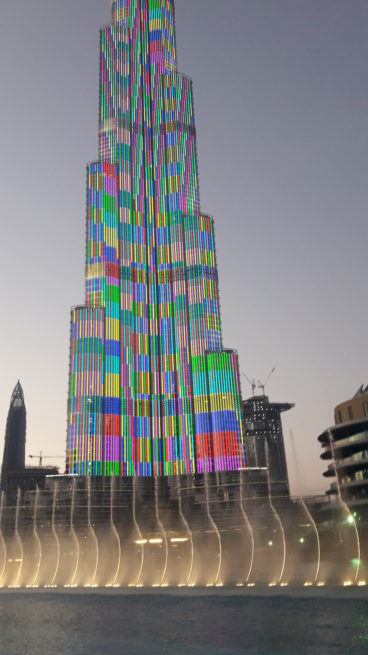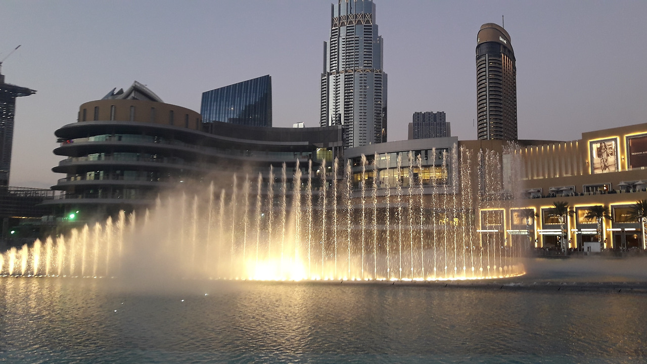함께 들려지는 음악은 "Sama Dubai", 두바이 통치자를 위한 곡으로 분수쇼의 처음에 연주되는 곡이었다. 신비로운 중동 음악에 맞추어 물줄기가 화려하게 춤을 춘다. 옆에 서 있는 부르즈 할리파도 지지 않는다는 듯 주변이 어두워지자 멋진 건물 외곽에 가지각색의 색상을 입혀 사람들의 감탄을 자아낸다. 다양한 디자인과 색상들로 변해가는 멋진 건물과 더불어 보이는 호수의 분수쇼는 화려함 그 자체였다.