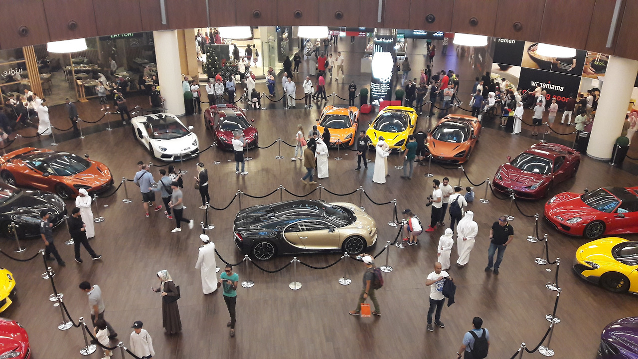 두바이 몰 내부의 인공폭포와 몰 내에서 진행된 자동차 전시