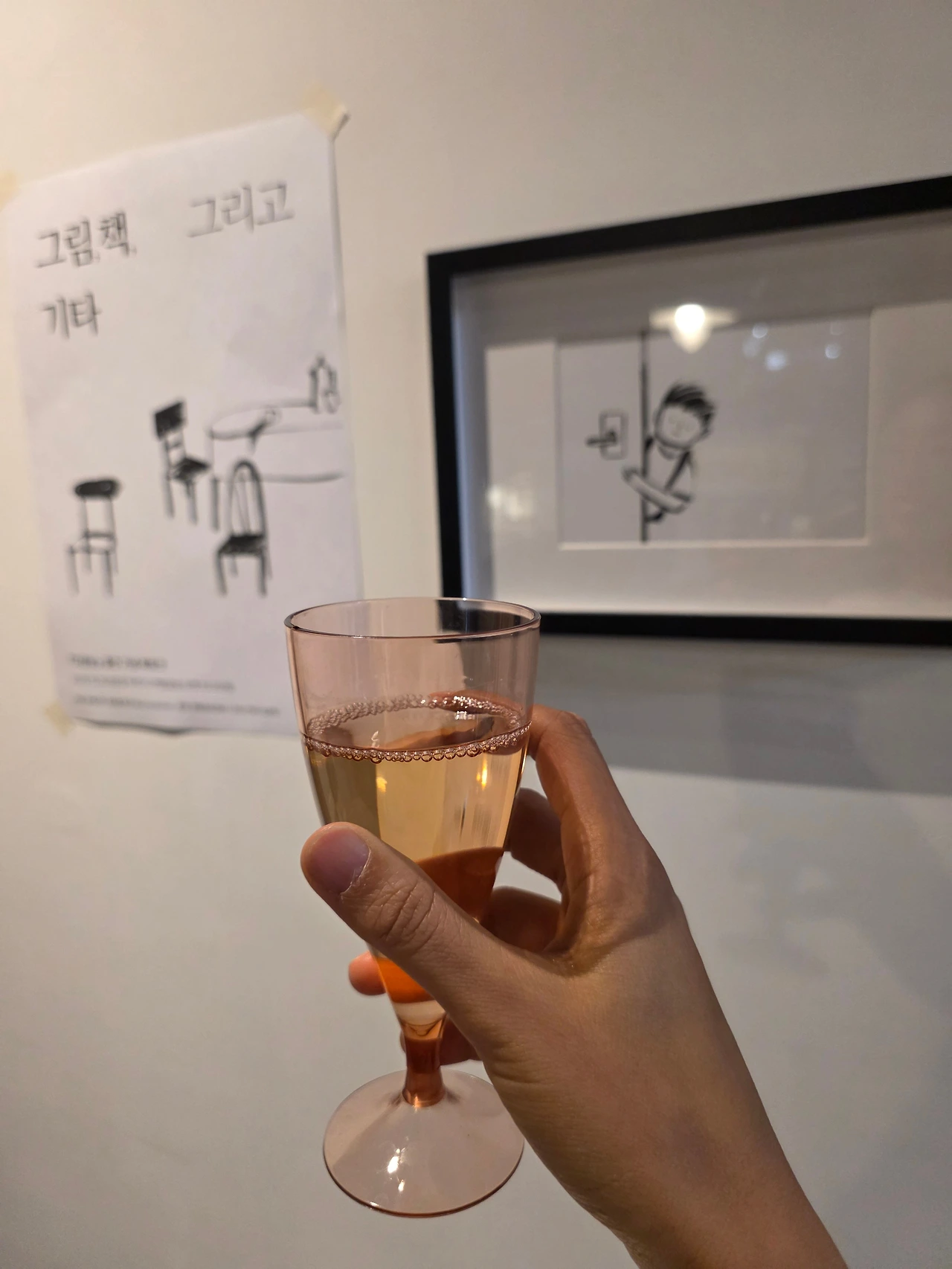 저녁 시간에 나 혼자서 괜찮을까? 어색하면 어쩌나 걱정했지만 생각보다 편안하다. 따뜻하게 반겨주는 꽃밭샘을 보니 오길 잘했다는 생각이 든다. 그림책 속 원화도 감상하고 와인도 한잔 마시며 책방의 저녁에 서서히 취해본다. 나 생각보다 혼자 잘 노는데?