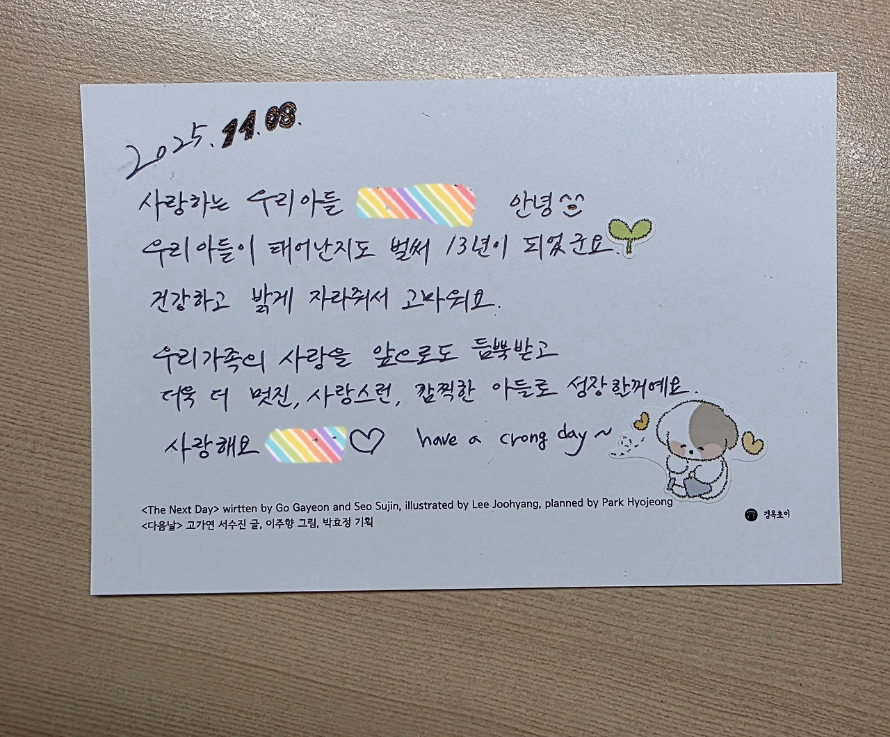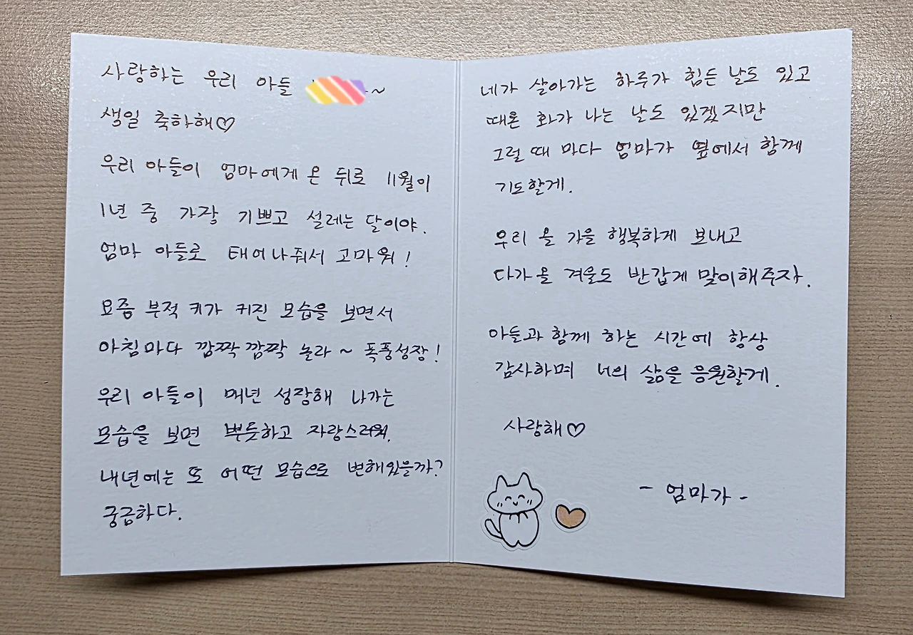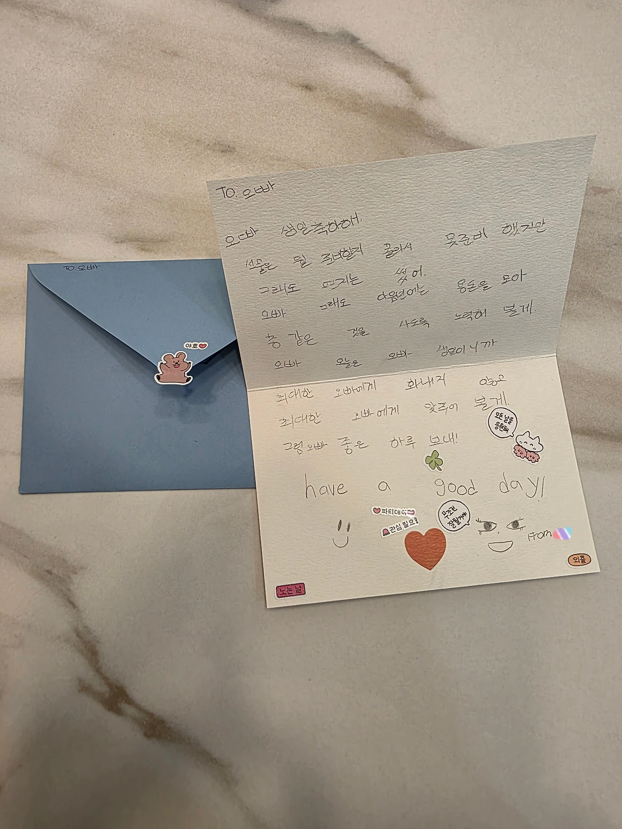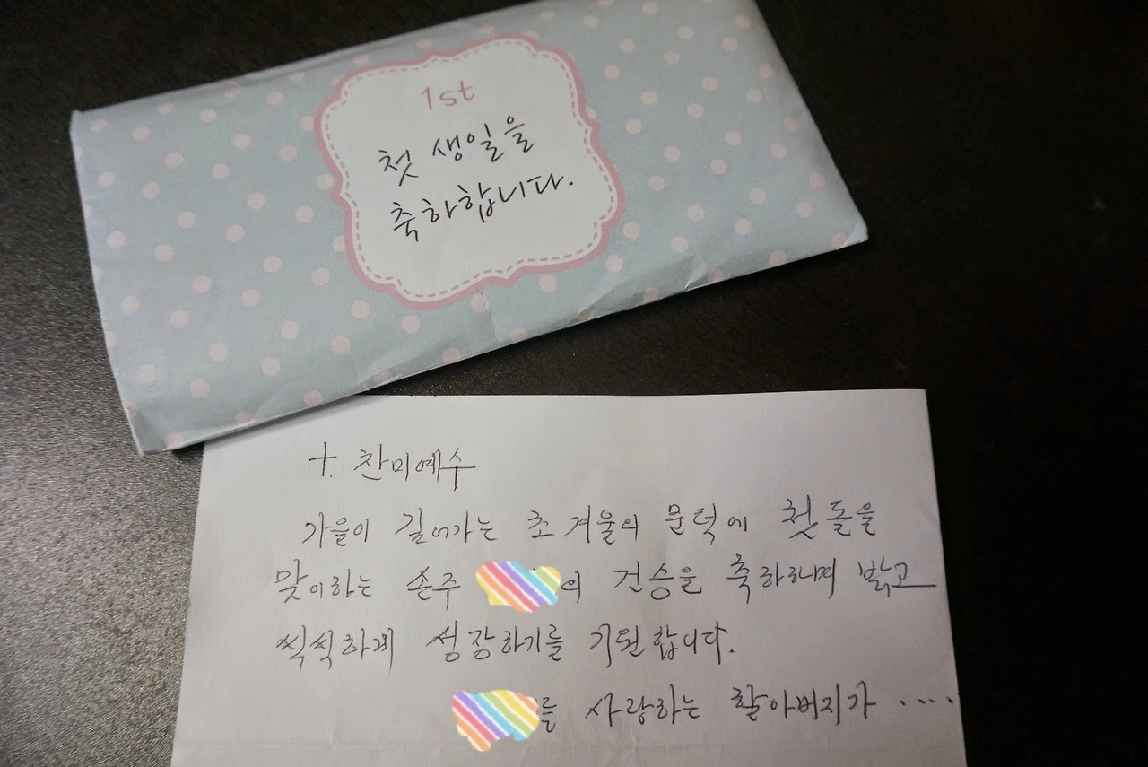 어느 순간부터 카톡으로 보내는 교환권과 이모티콘이 더 편해진 시대. 굳이 손글씨를 써야 하나 싶기도 했지만 편지를 받고 기뻐하며 보관함에 넣는 모습을 보니 이제 좀 알겠다.