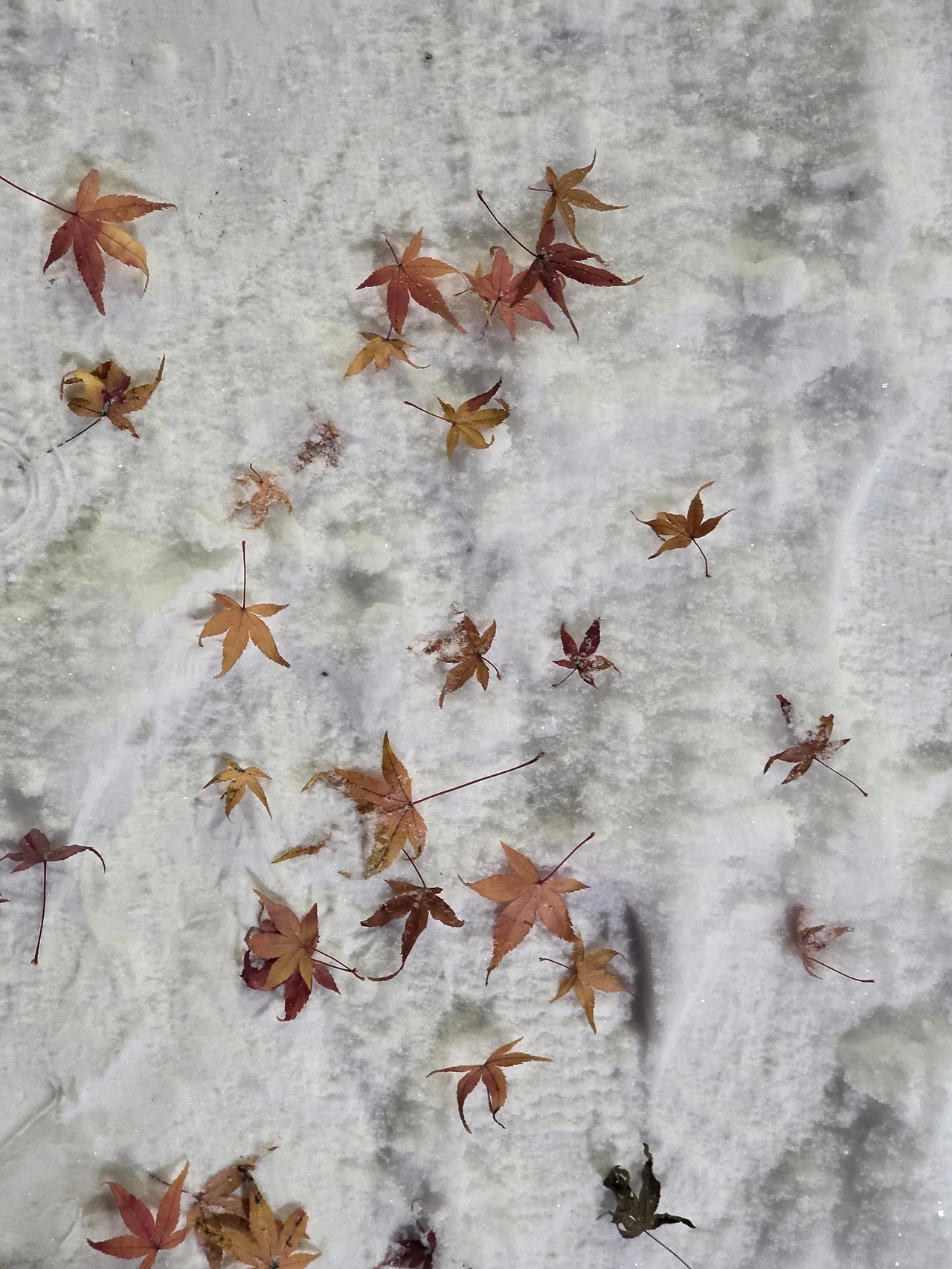 몸이 좀 녹아서 그런지 안 보이던 풍경도 눈에 들어왔다. 하얗게 눈이 쌓인 바닥에서 찍힌 빨간 도장. 첫눈과 단풍잎이라니~ 하얀 눈 위에서 보니 갈색도 노랑도 빨강도 훨씬 선명하게 보인다.