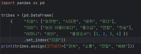 첫 챕터의 판다스는 DataFrame을 만드는 것만으로도 충분합니다. 열 이름을 정하고 dtype을 맞추는 일은 삶의 의미를 이름 짓는 작업과 닮았습니다. 다음 코드는 레아의 아들 네 명만을 샘플로 담아 “관계→들으심→연합→찬송”이라는 패턴을 구조화합니다.