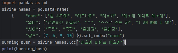 인덱스는 하나님께서 모세를 두 번 부르신 것처럼 "정확한 호출"을 가능하게 합니다. 다음 코드는 하나님의 이름 계시를 표로 만들고, set_index로 이름을 기준 삼아 특정 행을 빠르게 찾습니다.