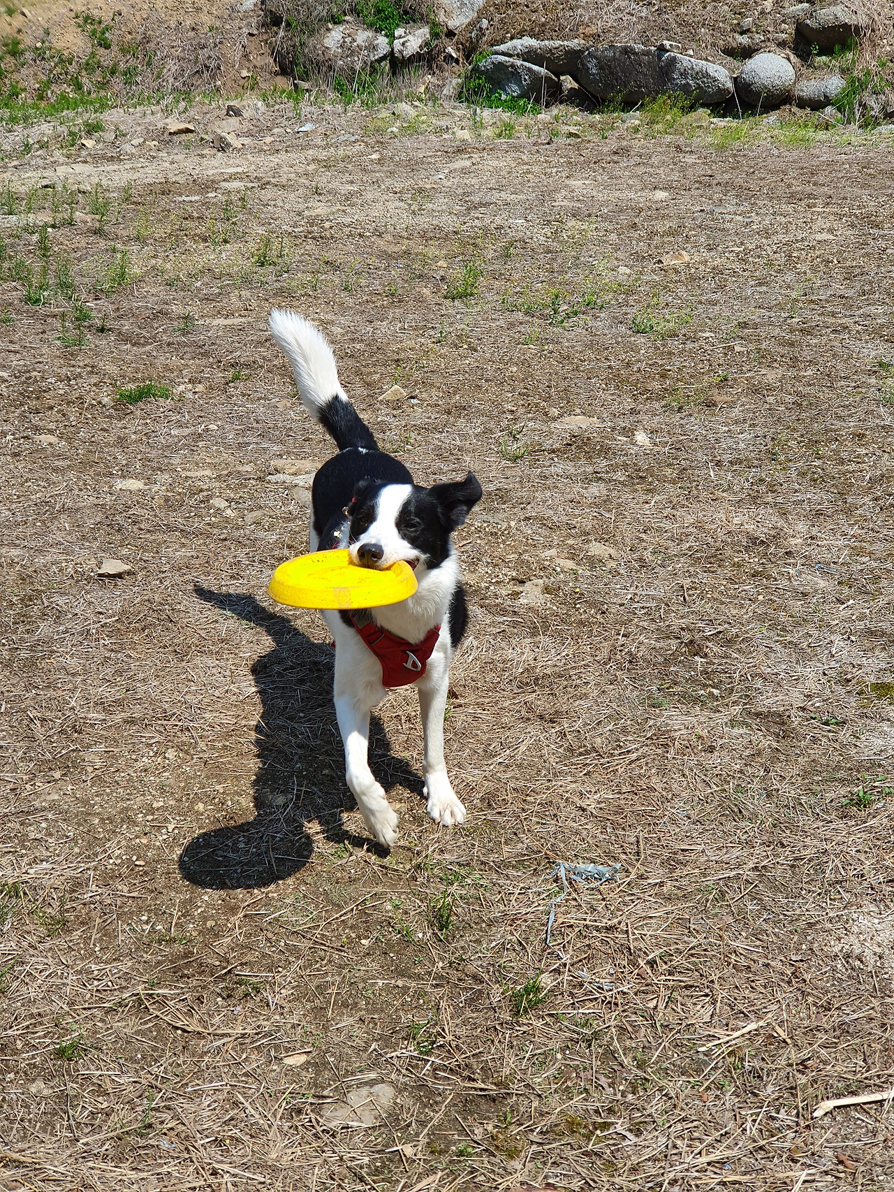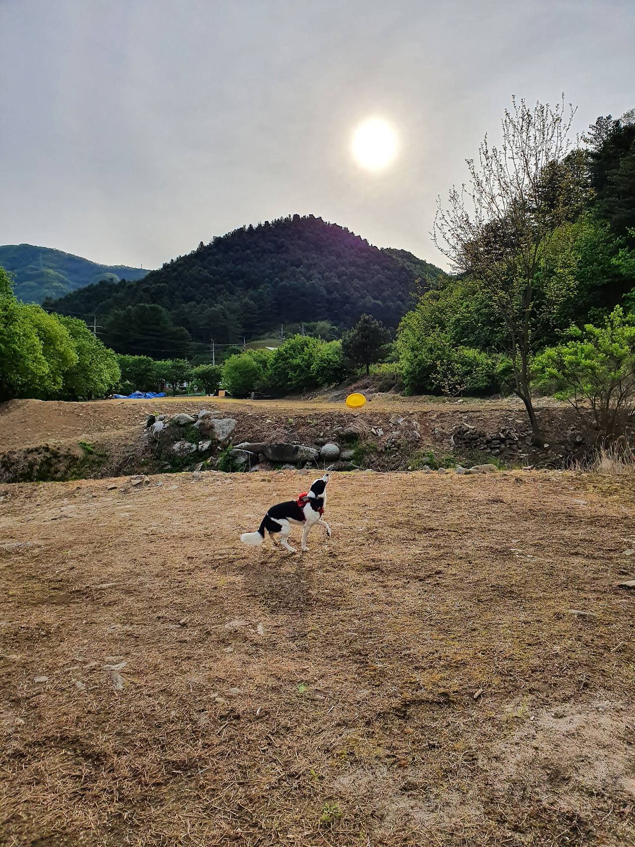 높이 던진 원반을 물어오는 태리. 며칠 원반던지기를 하지 않으면 운동을 하자고 자발적으로 원반을 물어오기도 한다.
