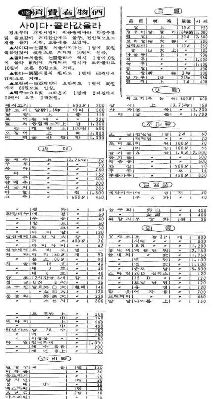 1972년도 매일경제신문에 게재된 소비자물가. 펩시와 코카콜라가 10원 올라서 50원이 됐다.