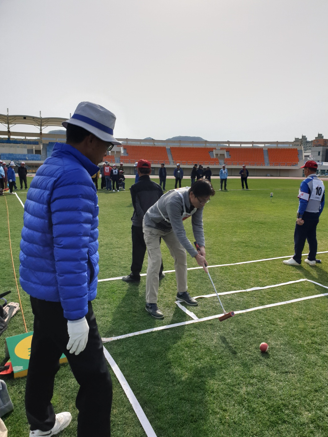 드디어 내 차례 1번 게이트. 선수는 자기 공을 들고 있다가 심판이 번호를 호명하면 내 번호를 복창하고 그제야 타석에 들어가서 공을 칠 수가 있다. 나는 1번 게이트를 거뜬하게 통과하여 2번 게이트 가깝게 공을 붙였고 다음 순서에는 우리 공을 터치하여 스파크 타격으로 2번 게이트를 통과시키고 내 공도 2번 게이트를 통과시켰다.