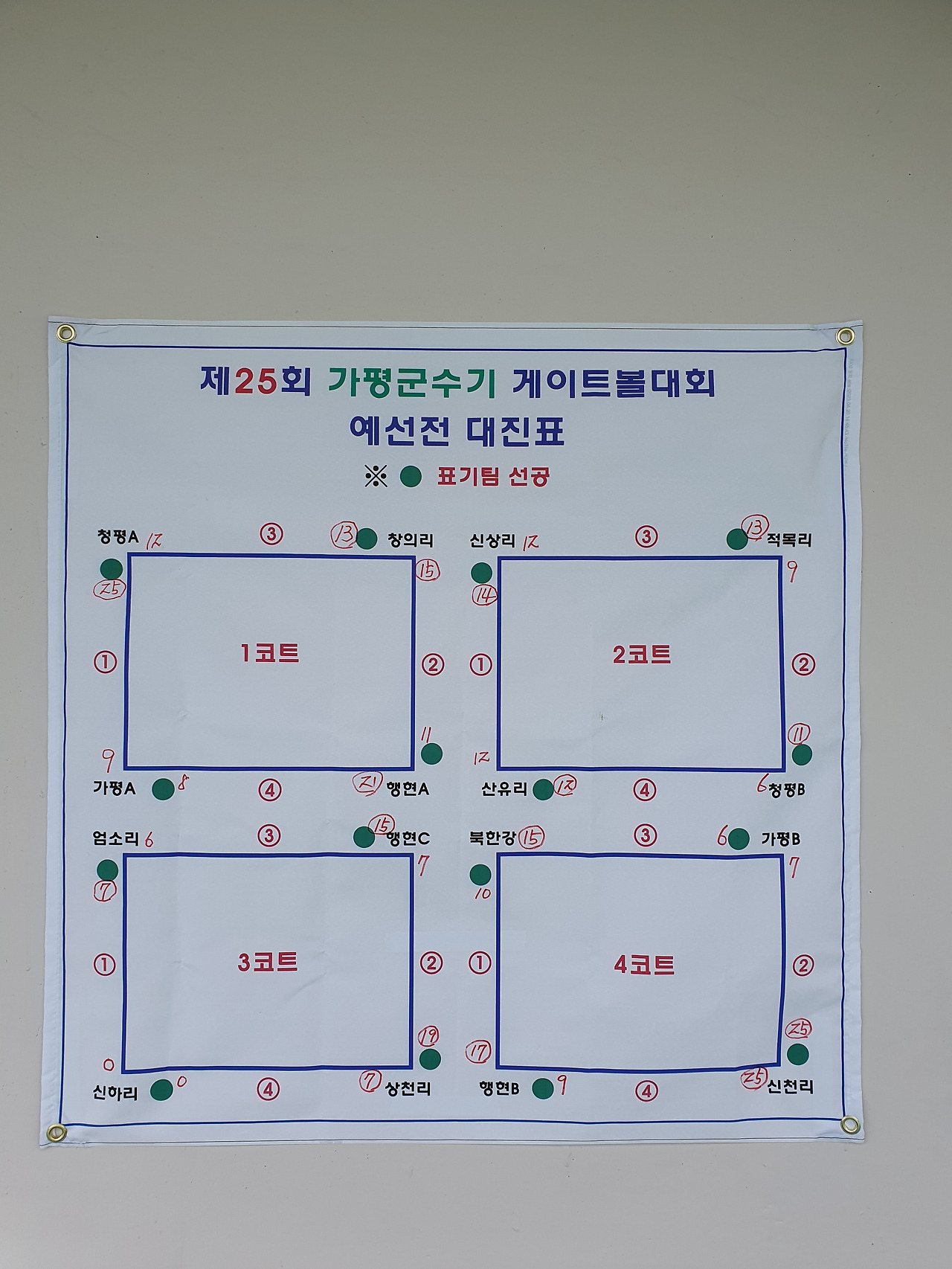 경기는 4개의 코트에서 펼쳐지며 각 코트에서는 역시 4개의 팀이 출전하여 코트당 2개 팀씩 결승 토너먼트에 진출하게 된다. 우리 팀은 2 코트에서 청평 B, 산유리, 적목리팀과 맞붙게 되었다.