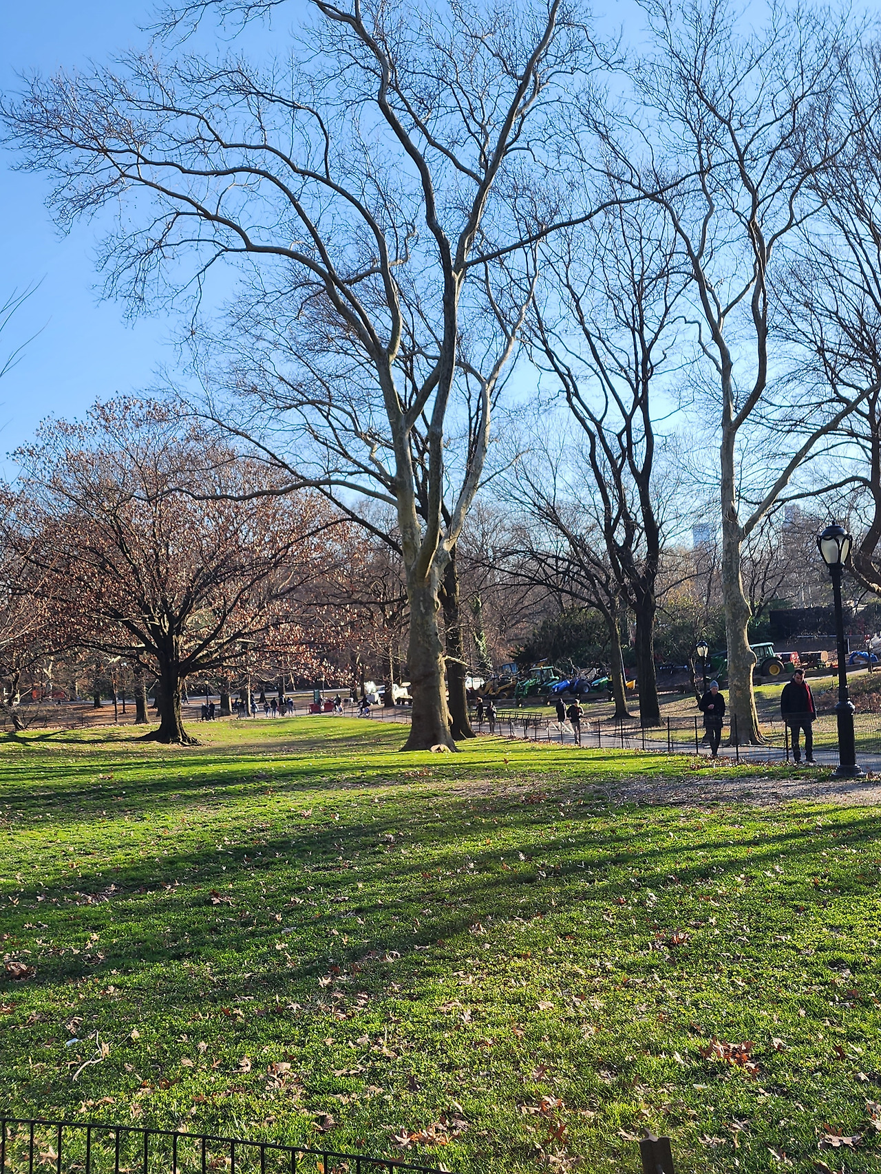 얼마 만에 오는 센트럴파크인지 생각해 보았다. 10여 년 전인 것 같다. 센트럴파크는 여전히 평온했다. 탁 트인 잔디밭이 우선 숨통을 트이게 했다. 나무들의 둥치도 엄청나게 컸다. 특이하게 한겨울인데 잔디가 푸릇푸릇한 곳이 많았다.