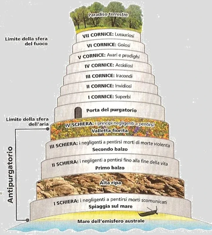 연옥(Purgatorio)은 3부 서사시의 두 번째로 인페르노(지옥)와 파라디소(천국) 사이에 있다. 연옥은 천국으로 향하는 영혼들이 자신의 죄를 깨끗이 하기 위해 고행을 겪는 도덕적 정화의 영역을 나타낸다.
