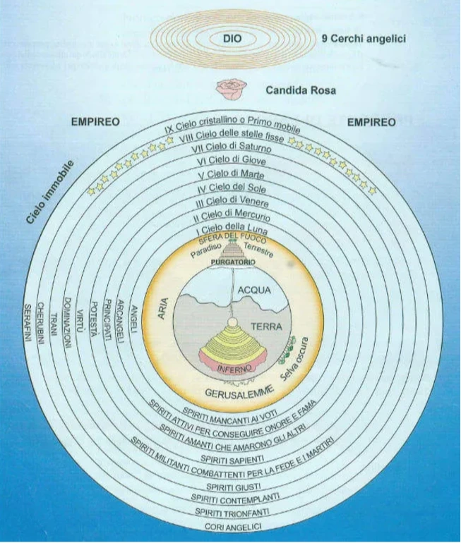 원동천(Cielo cristallino o Primo mobile) : 이곳은 물리적 우주의 마지막 영역이다. 하나님이 이 영역을 직접 회전시키고 있으며, 원동천에 둘러싸인 나머지 구역들은 원동천을 따라서 돌아간다.