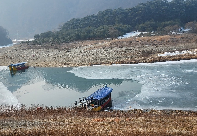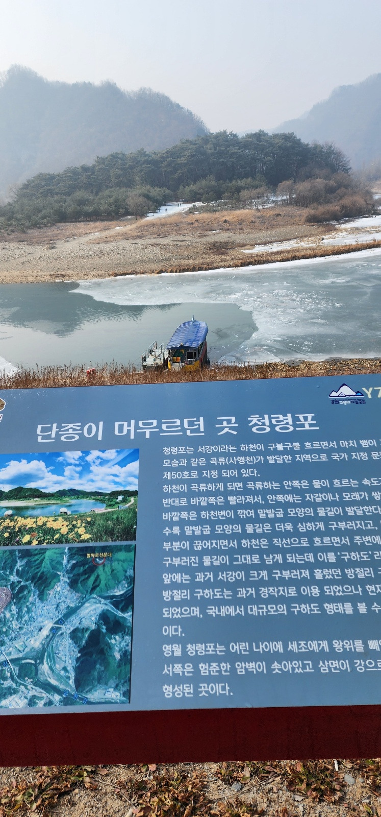 매표소에서 표를 받아 배를 타기 위해 강가로 향했다. 탁 트인 경치에 청령포가 한눈에 들어왔다. 배가 다니는 길을 제외하고 강은 대부분 얼어있었다.
