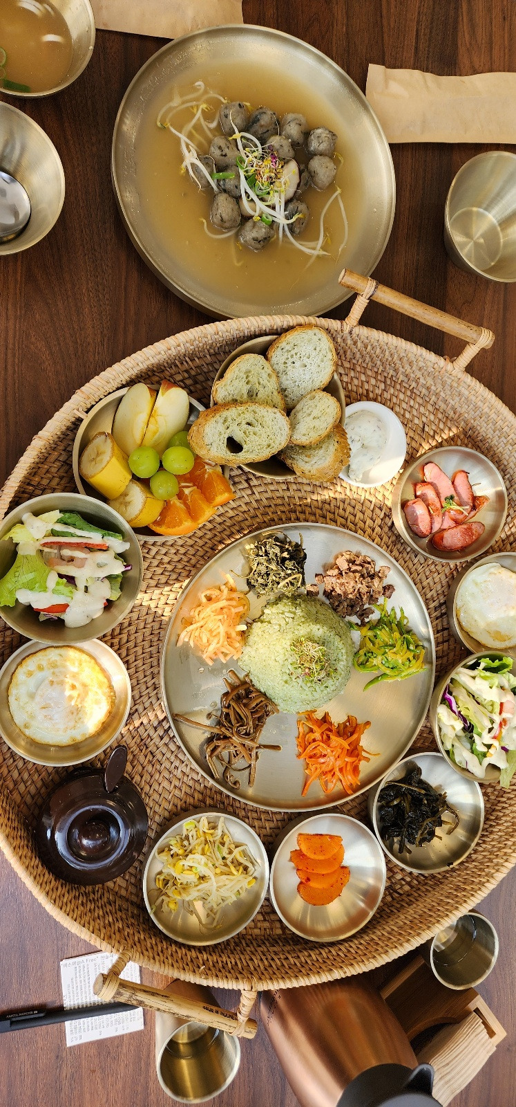 비빔밥 자리에 옹심이를 놓으면 옹심이 정식이다. 빵은 손도 못 댔고 과일도 남겼다.