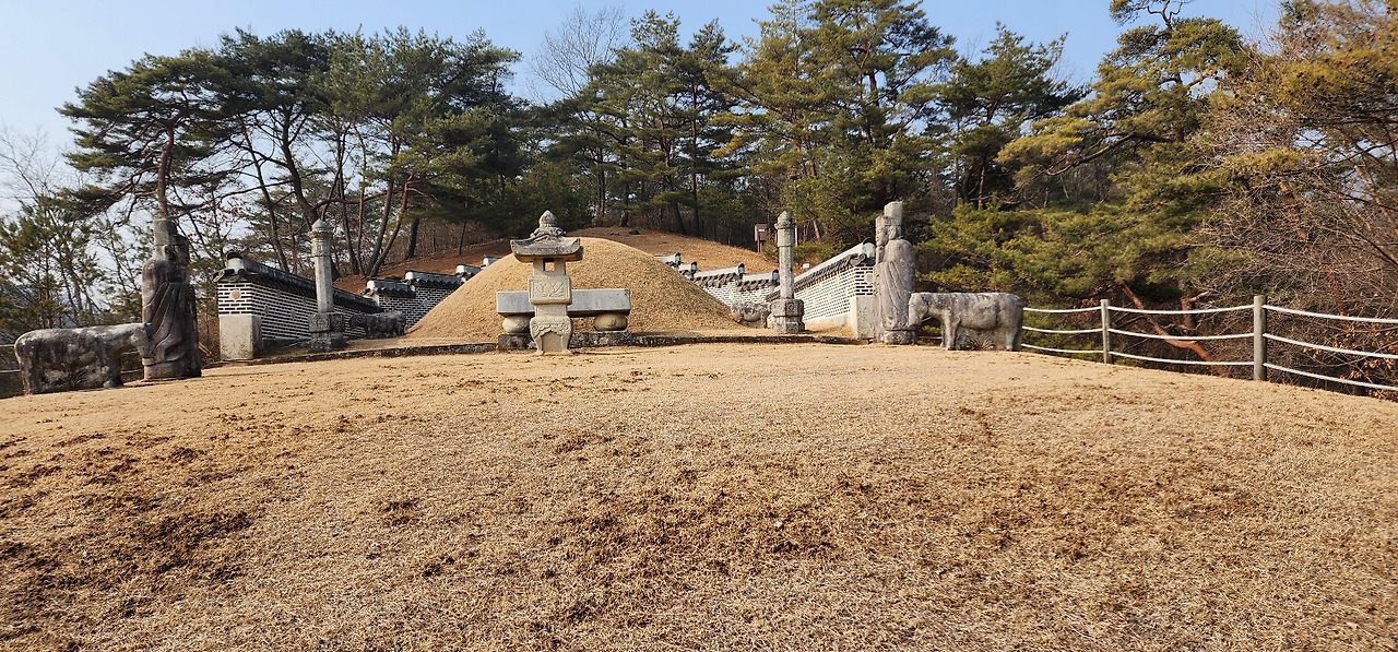 그런데 장릉의 구조는 조금 이상했다. 대개 왕릉의 시작을 알리는 홍살문과 정자각, 그리고 봉분은 정남향으로 곧게 뻗은 일직선이어야 했다. 그런데 장릉은 달랐다. 홍살문 오른쪽으로 정자각이 보이고 그 위 둔덕 위에 능이 있었다.