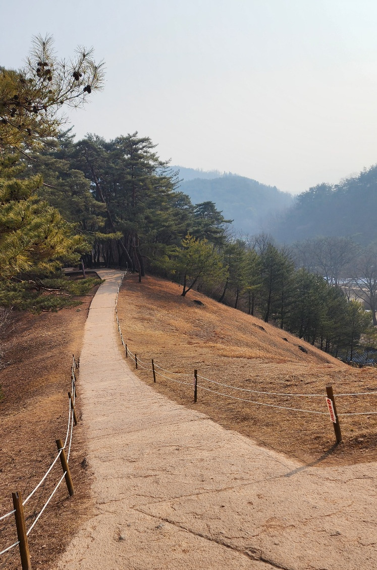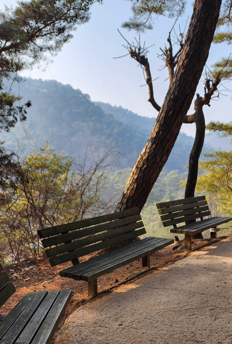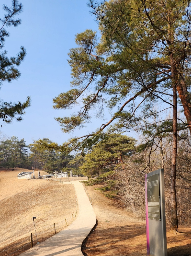 조금 쉬어가고 싶다는 생각이 들 즈음 멋진 소나무와 의자가 나왔다. 의자에 앉아 단종의 능을 바라보았다.