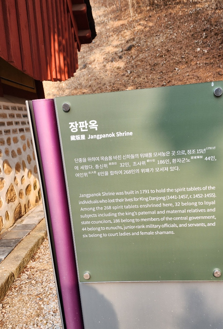다시 장릉에서 내려와 홍살문이 있는 곳으로 갔다. 이곳에는 단종을 위해 순절한 사육신과 생육신 등 충신을 비롯한 268인의 위패를 모신 배식단사와 장판옥, 그리고 단종의 시신을 수습한 엄흥도의 정려비가 있었다.