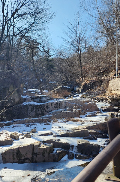 계곡에서 물이 내리는 소리가 졸졸 들려서 가까이 다가가 보니 물은 얼어 있고 그 위에 눈까지 덮여 있었다. 물은 얼음 아래에서 흐르고 있었다.