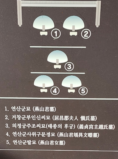 이곳은 세종의 넷째 아들 임영대군의 땅이다. 그런데 연산군의 묘만 있는 것이 아니라 다섯 개의 묘가 있다.