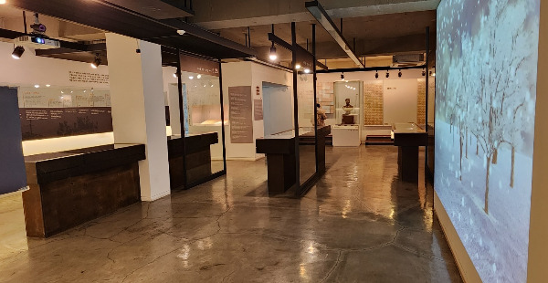 문을 열고 들어가면 정면에 김수영 시인의 캐리커처가 보인다. 전시관은 1층과 2층으로 되어 있는데 1층은 제1전시실이다.