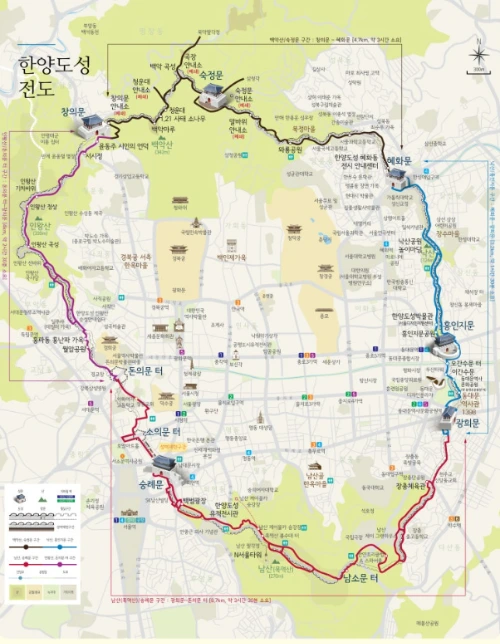 한양도성은 태조 5년(1396)에 백악(북악산), 낙타(낙산), 목멱(남산), 인왕의 내사산(內四山) 능선을 따라 축조한 이후 여러 차례 개축하였다.
