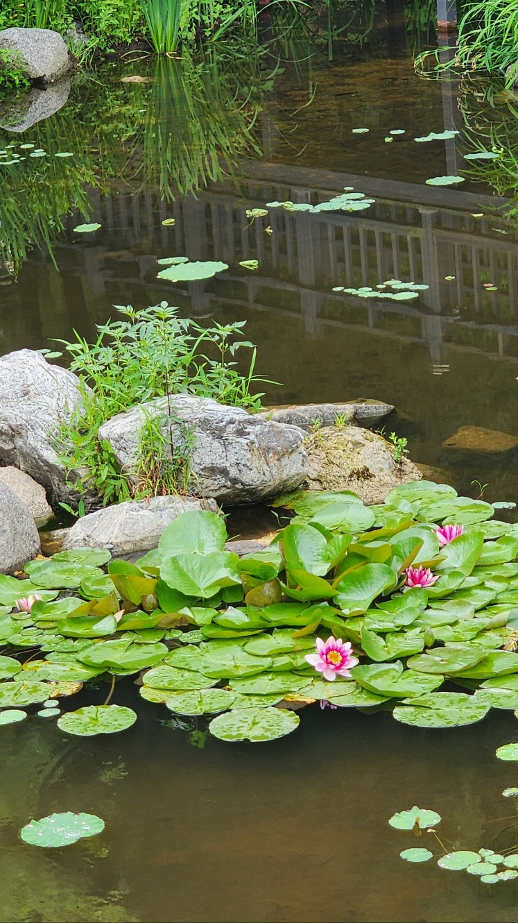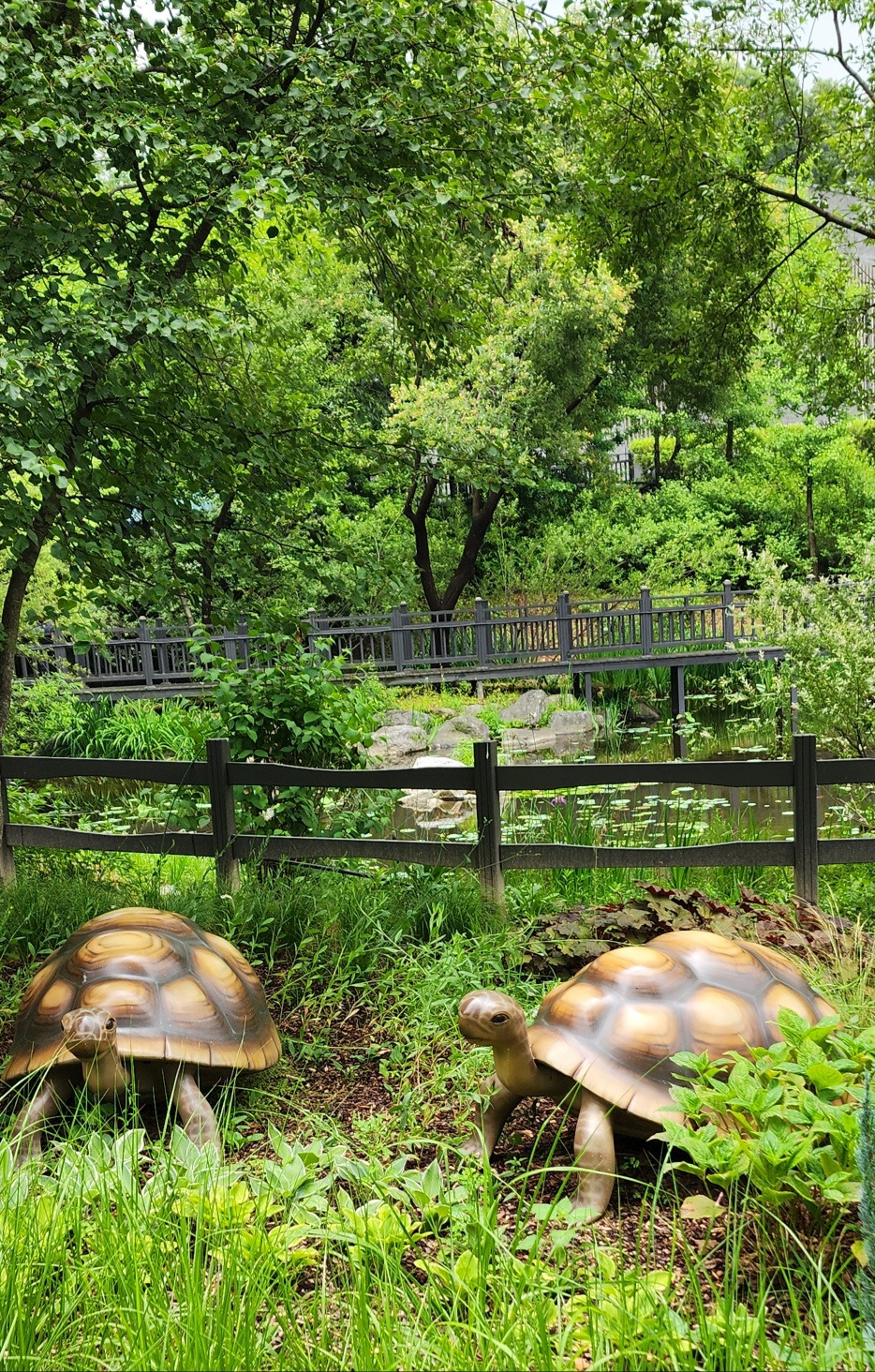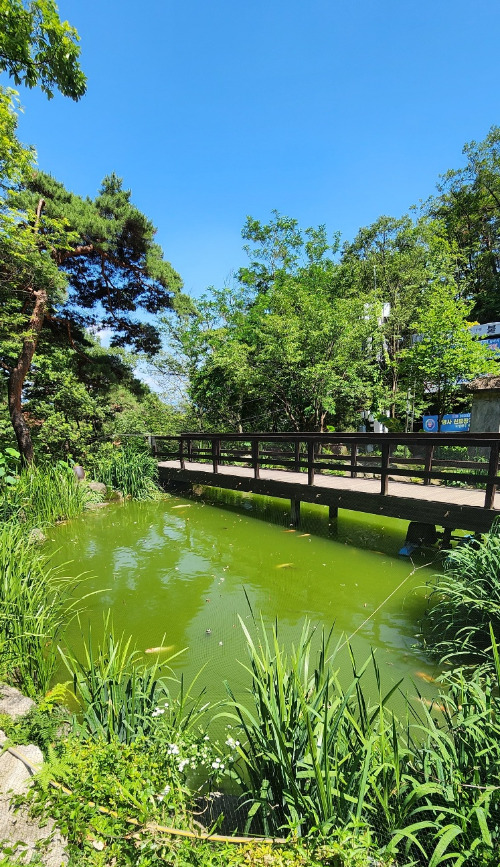 마치 동화 속으로 들어간 느낌이었다. 사진을 찍은 후 불암산 수국정원이 있는 곳으로 천천히 걸어갔다. 가는 길에 연못이 보였다. 거북이 두 마리가 연못 앞에 있었다. 아직 연꽃이 필 시기는 아니어서 겨우 세 송이가 연꽃의 명맥을 유지하고 있었다.