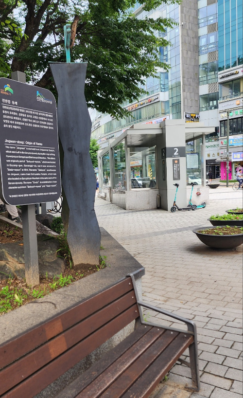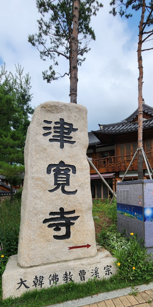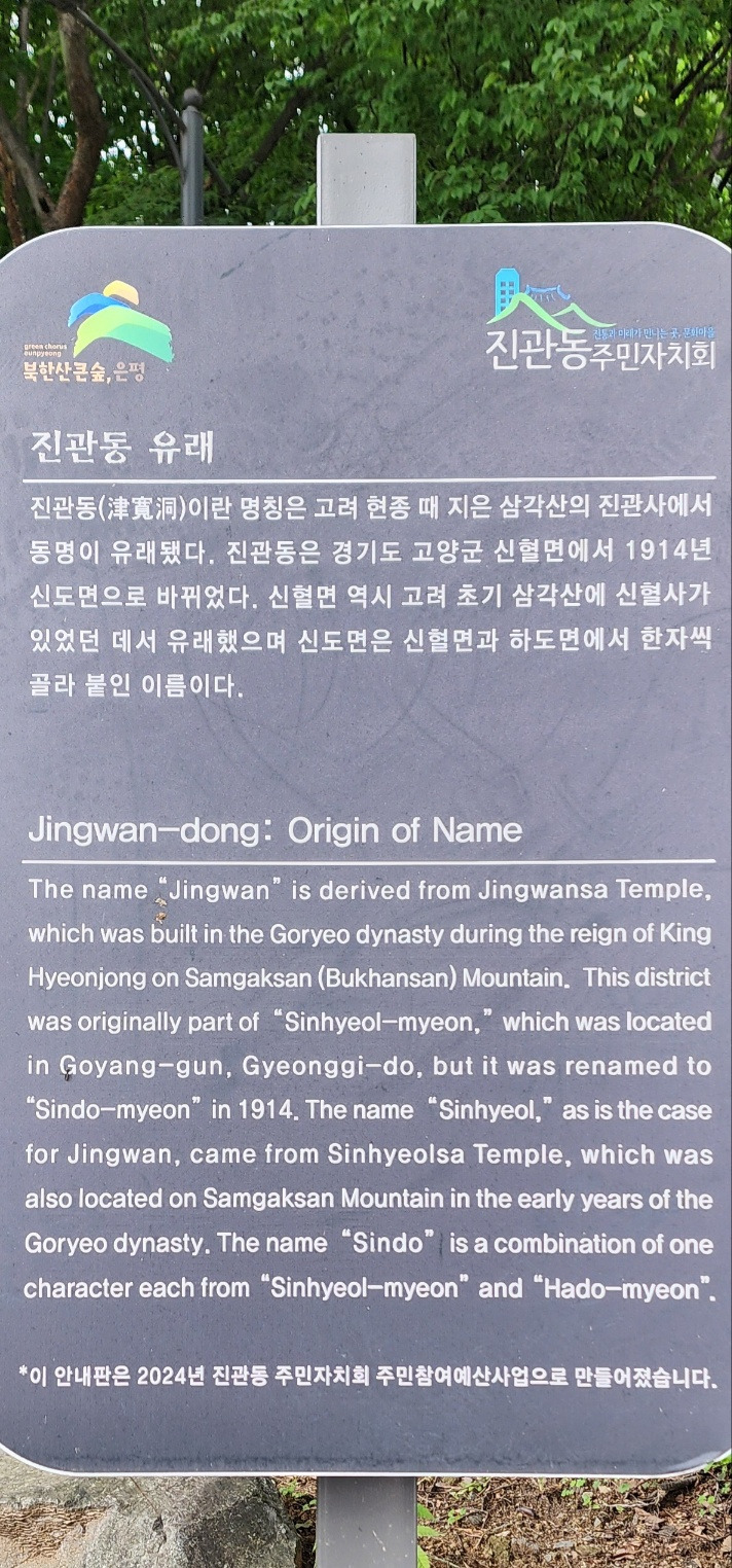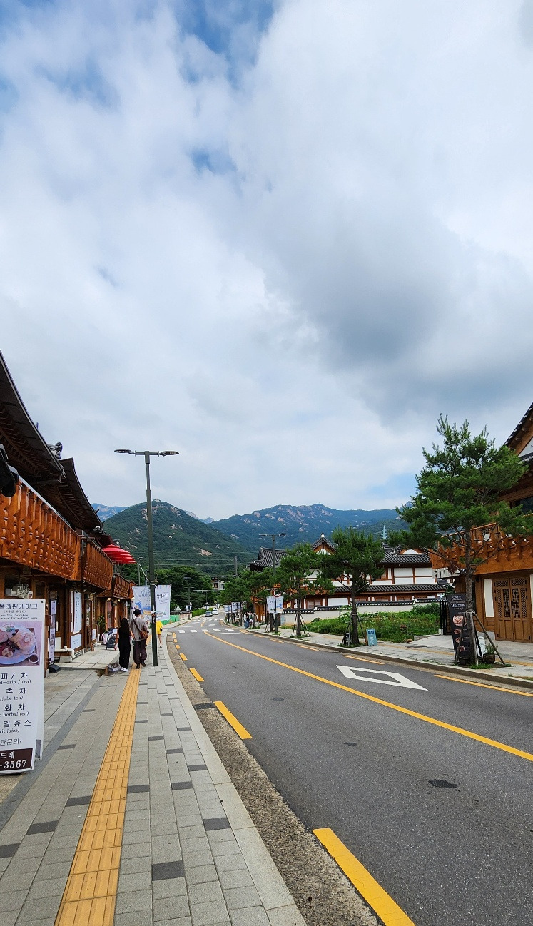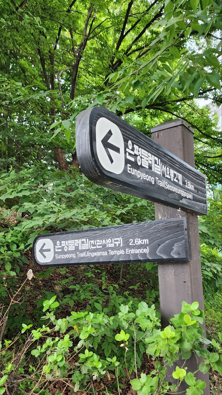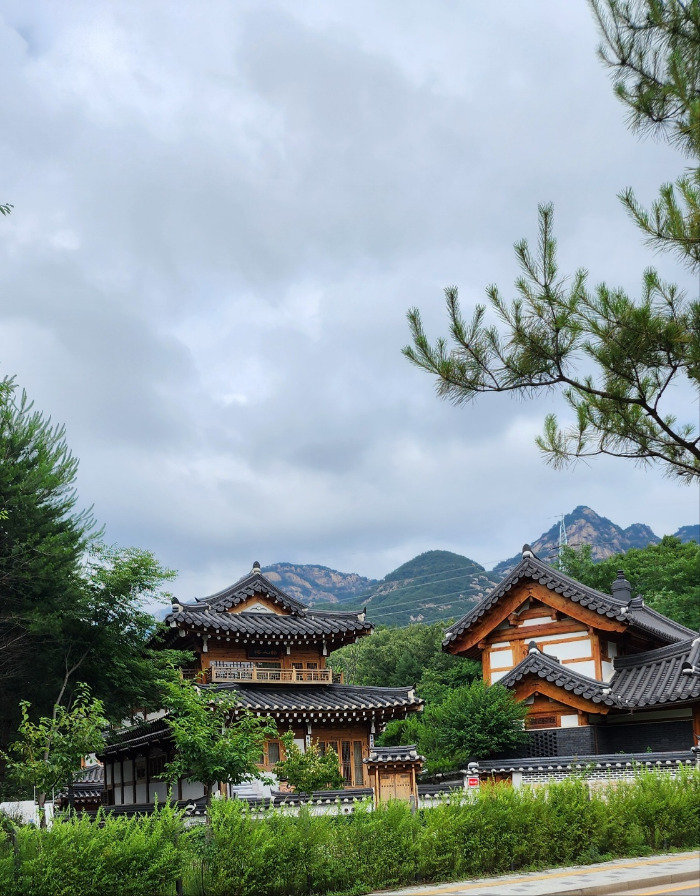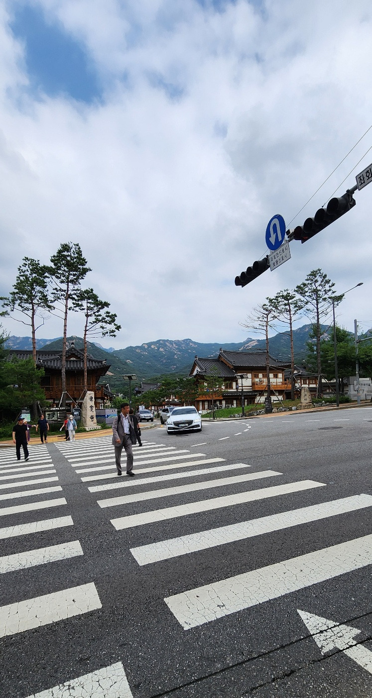 가파른 길을 내려와 발이 편편해지자 다시 걸을 힘이 솟았다. 신호등 앞에 서서 길 건너편을 보니 진관사 가는 길 이정표가 보이고 멋진 한옥마을이 나타났다. 산과 한옥이 어울려 운치 있었다.