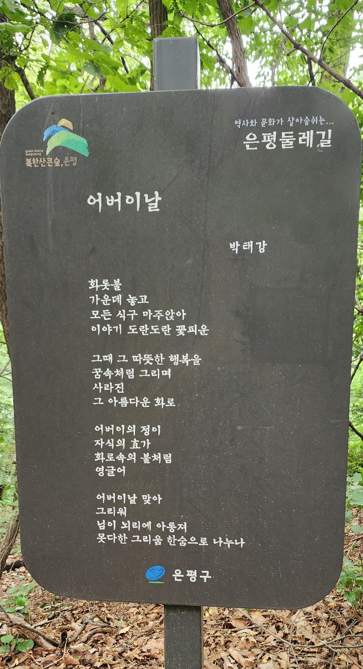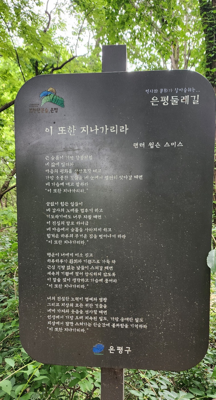 둘레길을 걷는 사람들에게 물어보아도 대부분 모른다고 했다. 그런 면에서 은평구의 배려가 아쉬웠다. 팻말 하나만 붙여놓으면 고생하지 않고 바로 내려가면 되는데 내려가는 곳을 모르니 산을 샅샅이 뒤질 수도 없는 노릇이고 참 난감했다. 솔직히 나는 산을 헤매고 다닐 체력이 없다.
