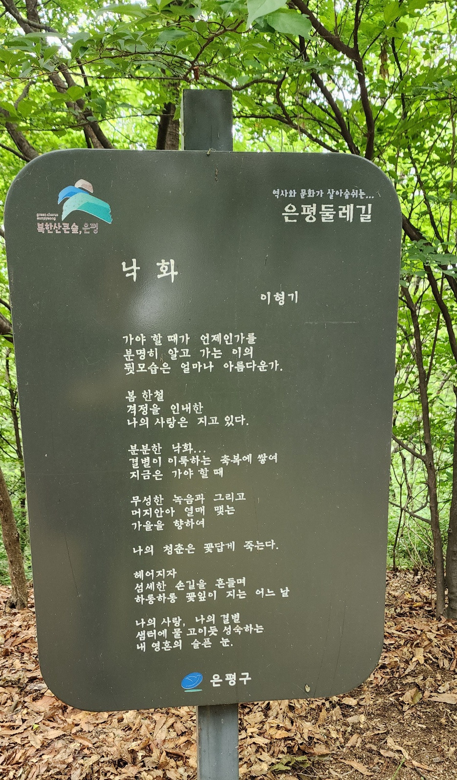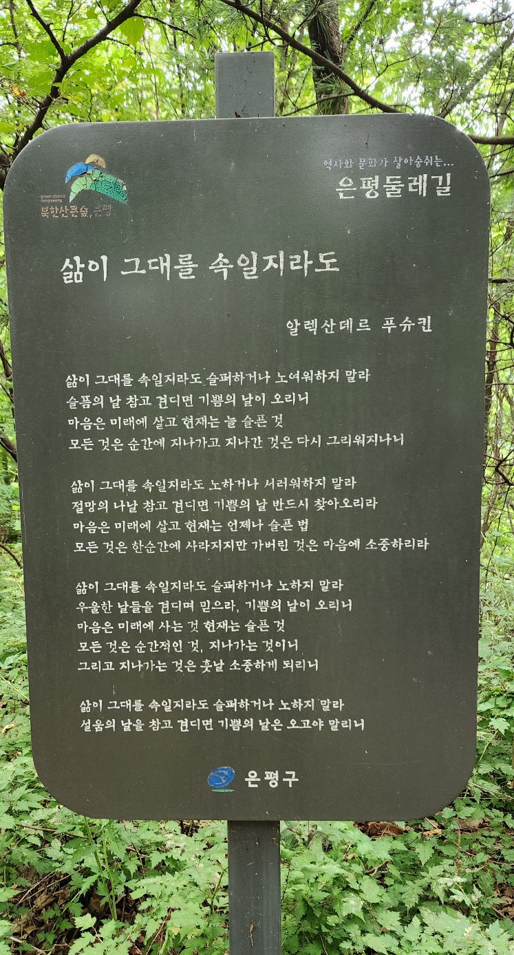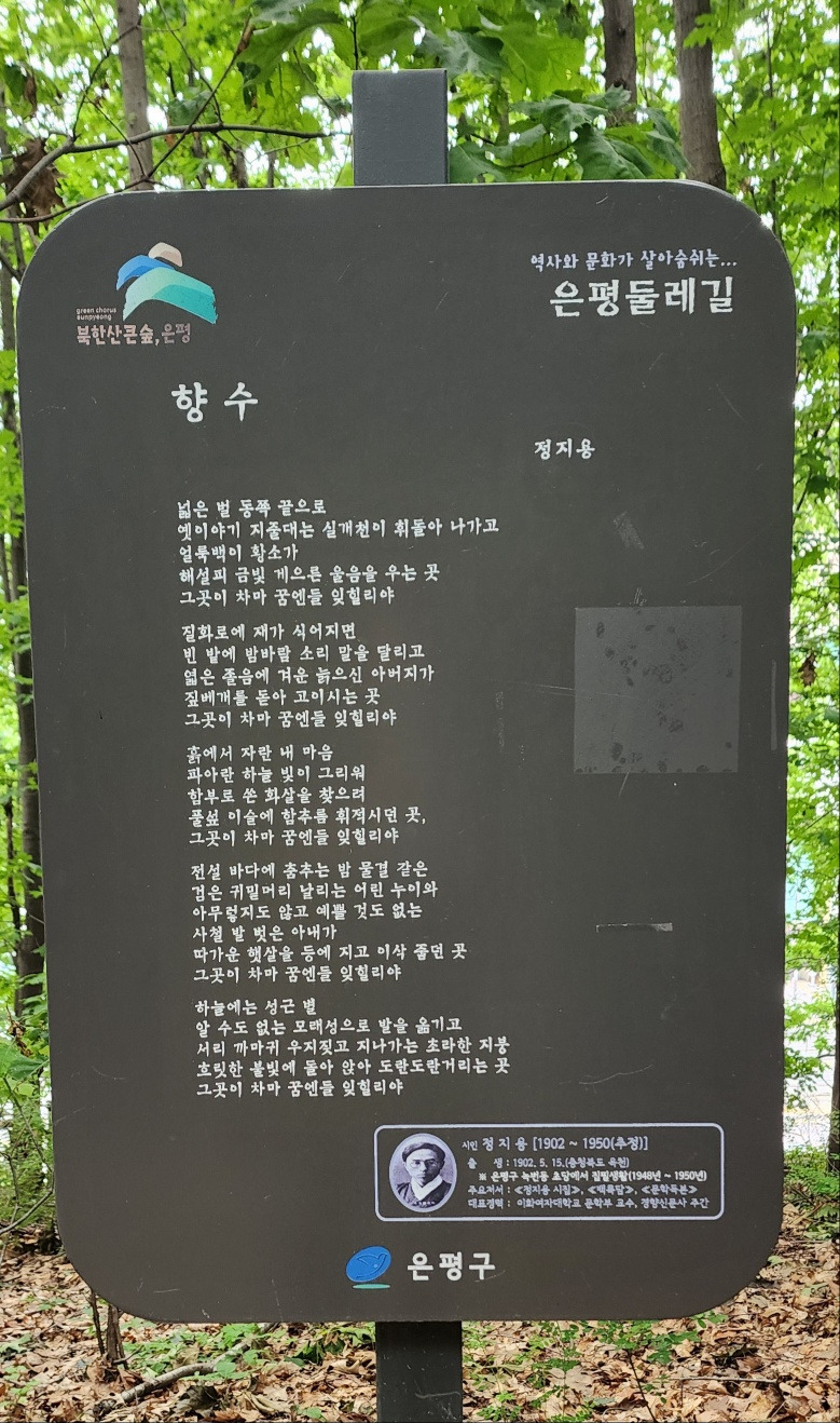 이렇게 9개의 설명 패널이 끝나면 이말산 둘레길의 끄트머리에 닿는다. 이곳에서 진관사로 내려가는 길은 내리꽂는 비탈길이다. 차라리 올라가는 게 낫지, 내려가는 길이 가파른 것은 싫다.