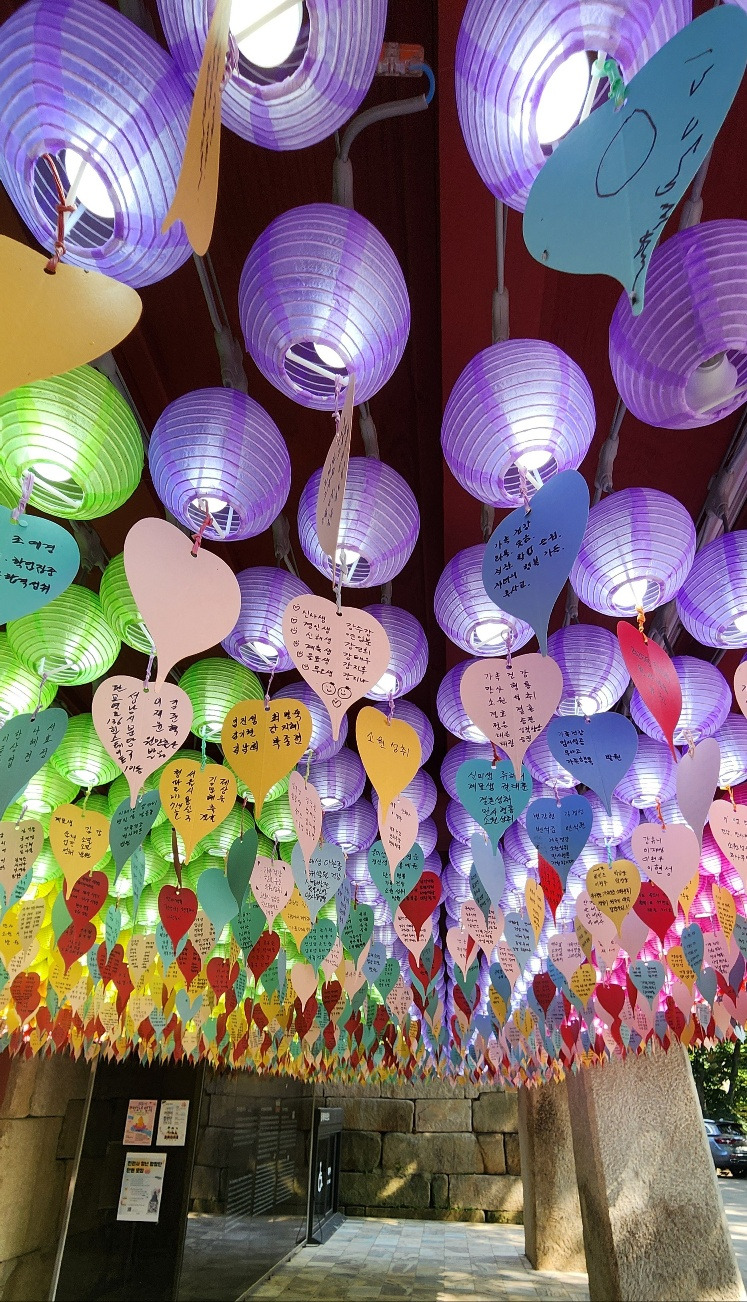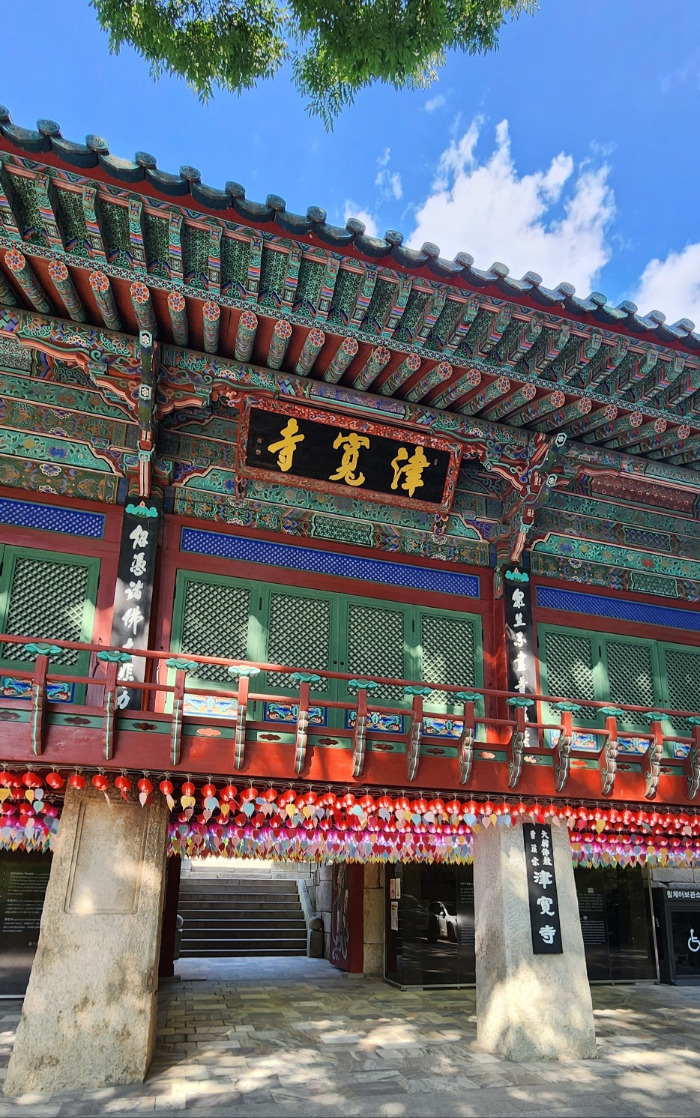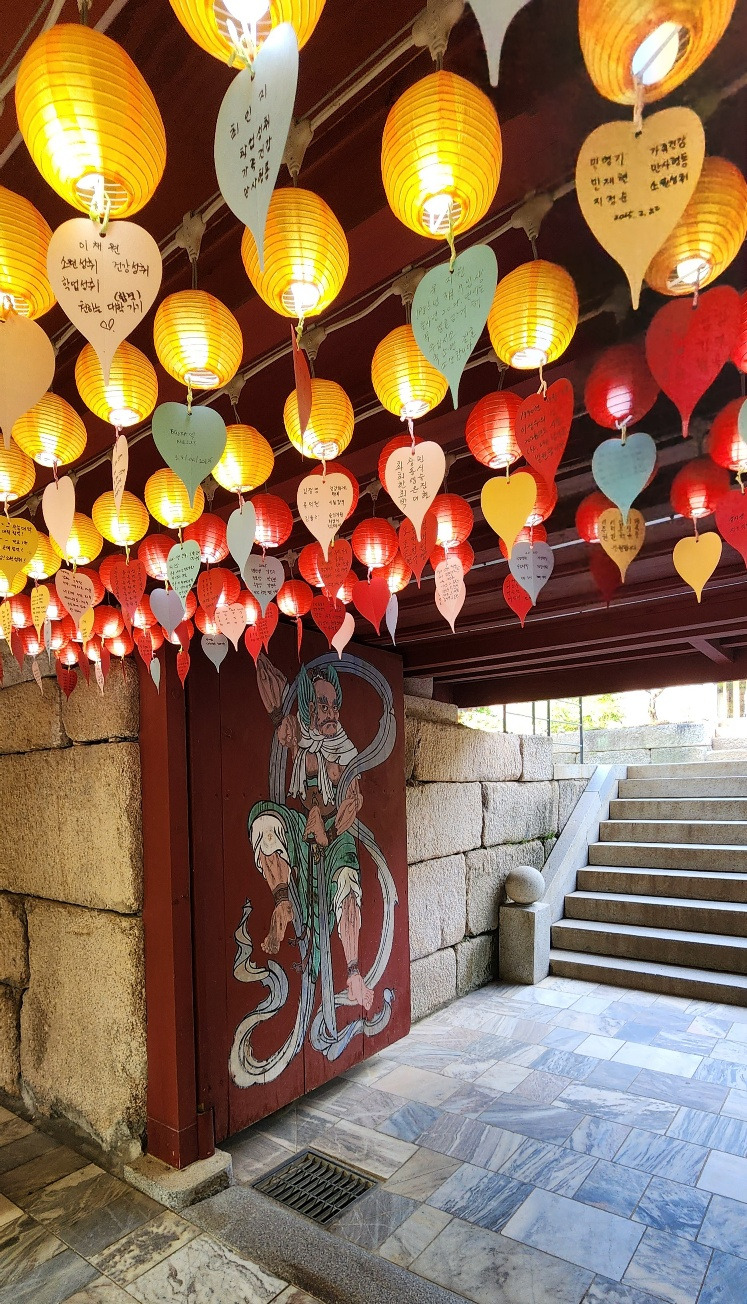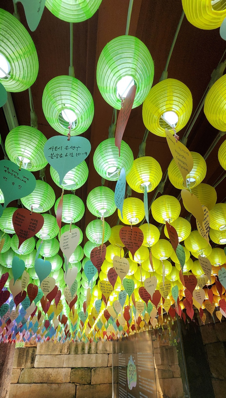 진관사 홍제루 건물로 들어가 계단을 올라가면 대웅전으로 갈 수 있다. 천장에는 연등이 걸려있는데 사람들의 소망이 빽빽하게 적혀있다. 누군가의 절실한 염원이 적힌 나뭇잎 모양의 글들이 연등과 함께 바람에 흔들려 마치 꽃잎 같다.