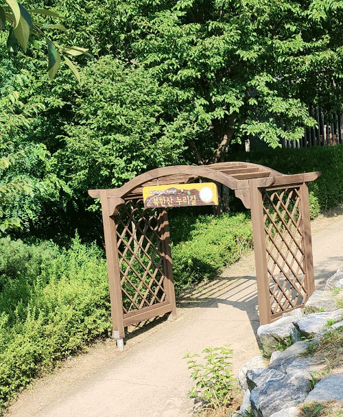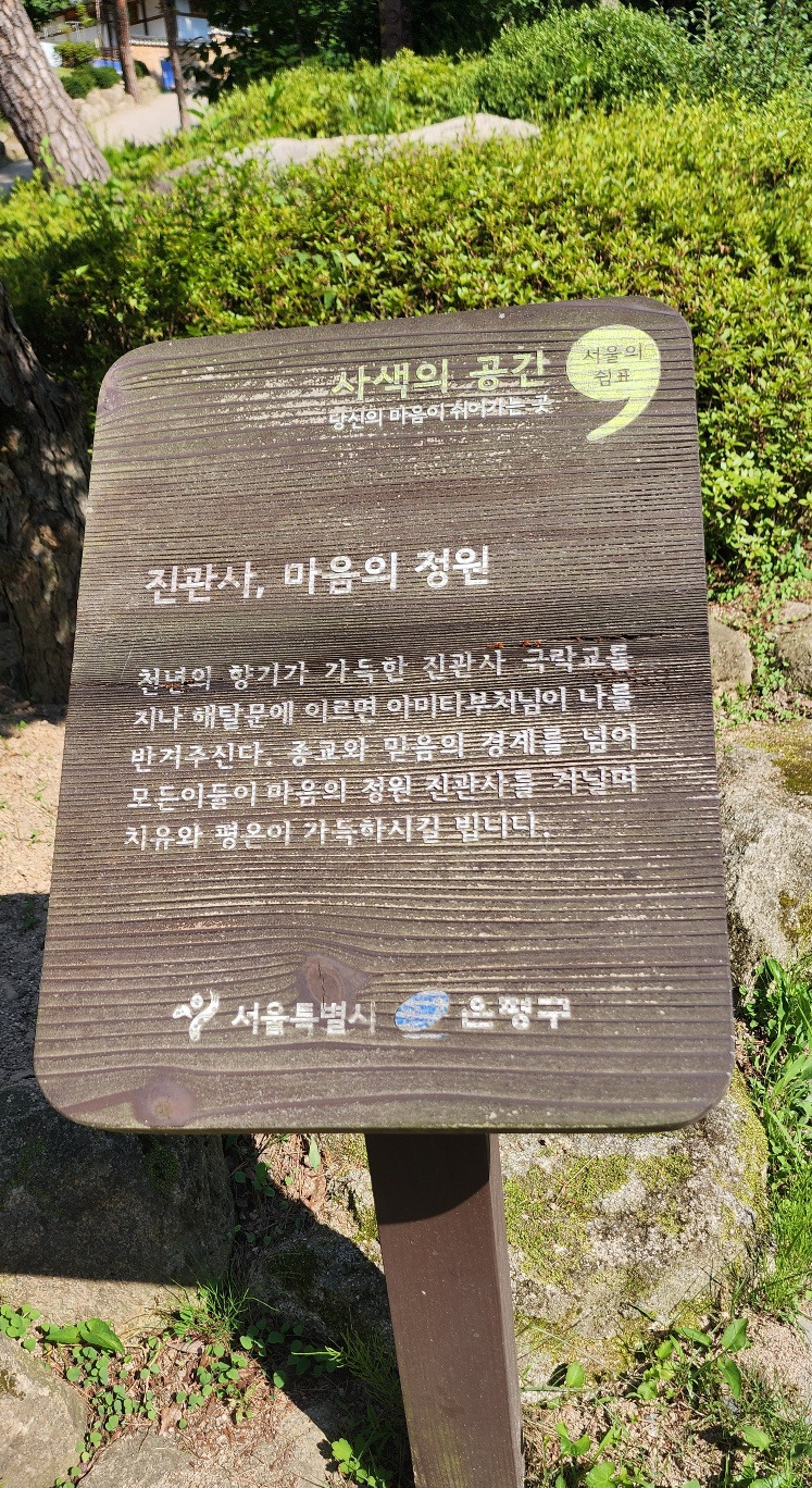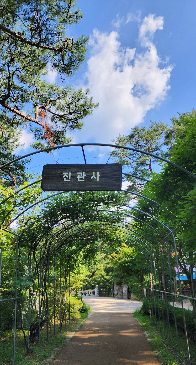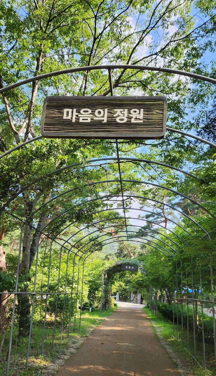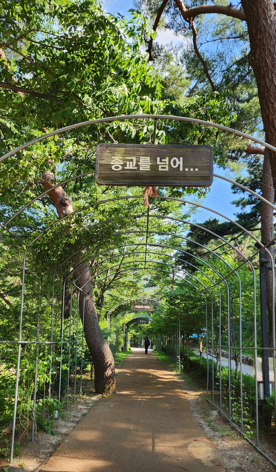 주차장을 가로질러 절로 들어가도 되지만 인도가 따로 마련되어 있다. 철제 터널을 걷다 보면 자연스럽게 종교를 넘어, 마음의 정원, 진관사 등의 글을 읽게 된다.