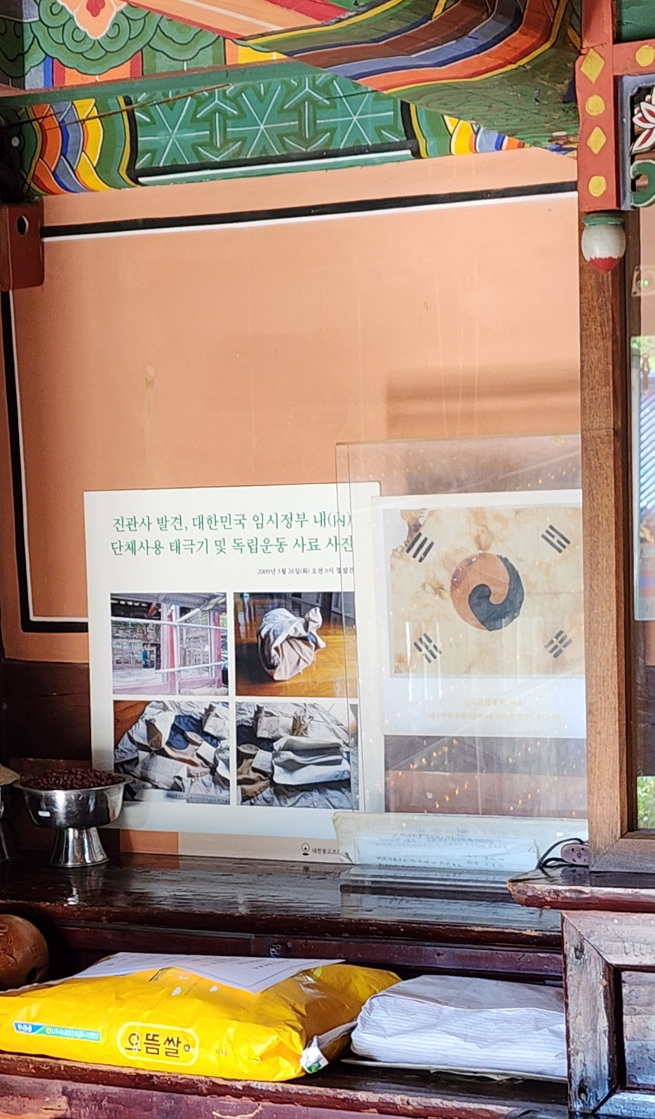 한지는 칠성각의 불단(佛壇)과 기둥 사이에 있었는데 태극기를 보자기처럼 이용하여 싸여 있었다.