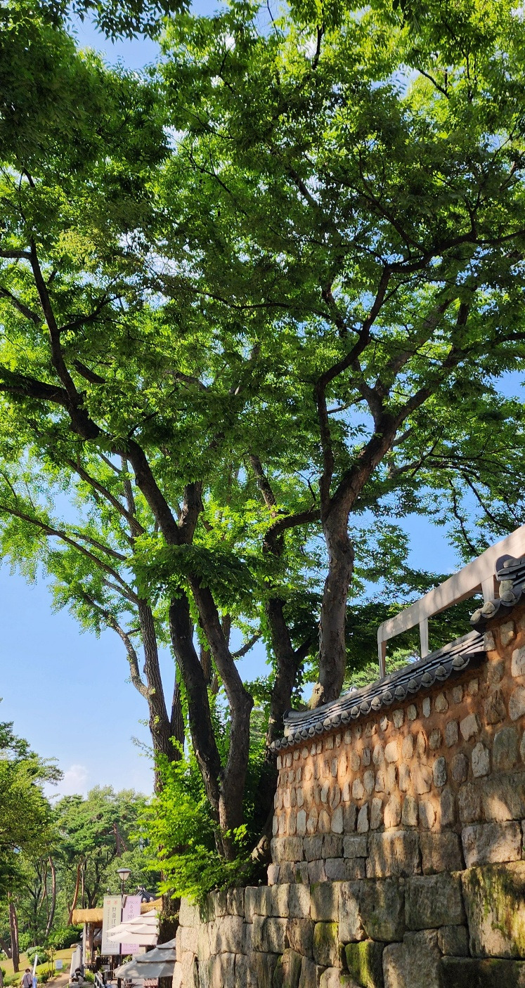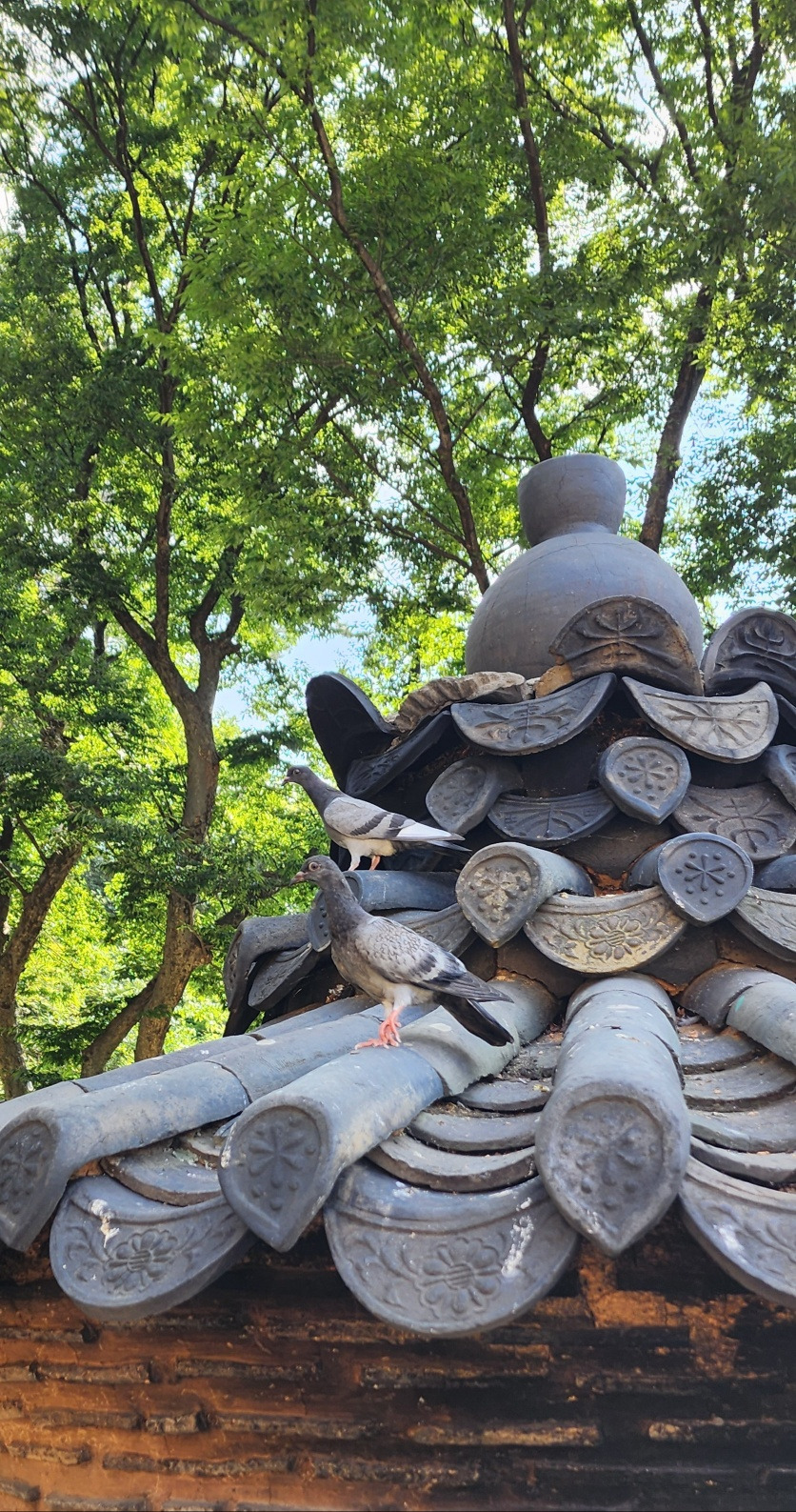 기와 위에 비둘기 두 마리가 앉아 있기에 휴대폰을 들이댔는데 내가 무섭지 않은지 미동조차 없다. 기와색과 비슷해 자세히 보아야 비둘기가 보인다.