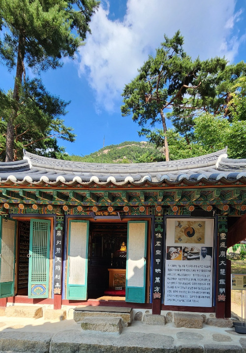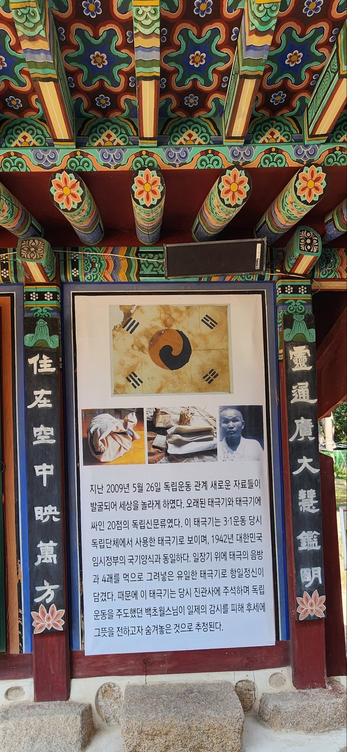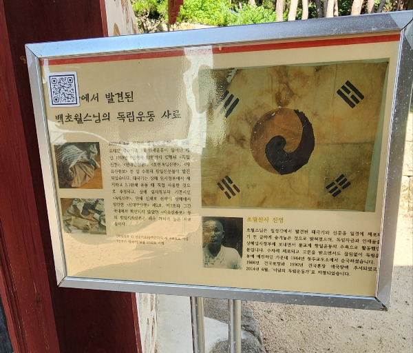 칠성각은 다른 전각에 비해 현저하게 작다. 벽면에는 태극기 그림과 백초월 스님에 대한 설명이 있고 안내판도 친절하게 세워져 있었다.