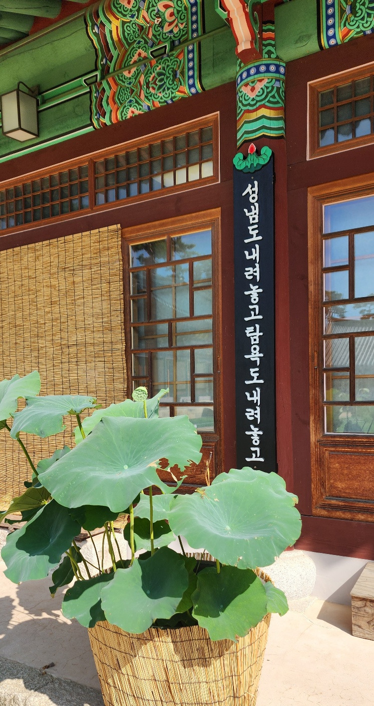 아무려나 커다란 연꽃을 심어놓은 화분에 핀 연꽃 봉우리와 나옹선사의 시가 인생의 덧없음을 생각하게 한다.