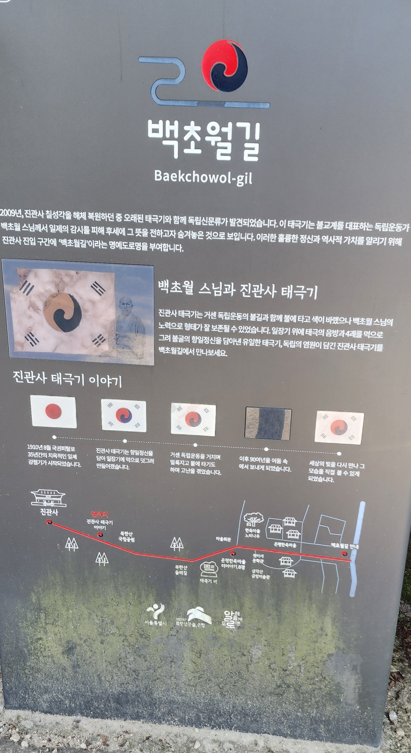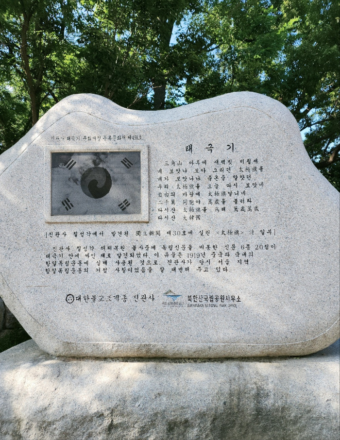 진관사가 가까워지면 태극기가 새겨진 커다란 비석이 눈에 띈다. 진관사는 독립운동 거점 사찰로도 유명하다.