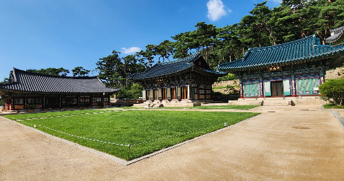 계단을 올라가면 탁 트인 잔디밭이 있고 대웅전이 보인다.