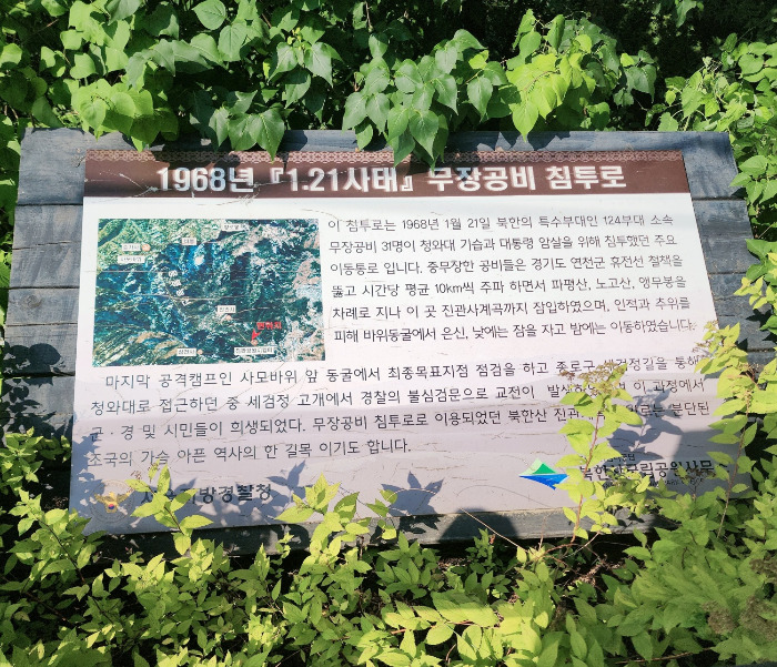 1968년 1.21 사태 때 북한의 무장 공비가 이동한 통로 중 진관사 계곡도 지났는지 그 내용을 알리는 입간판도 있었다.