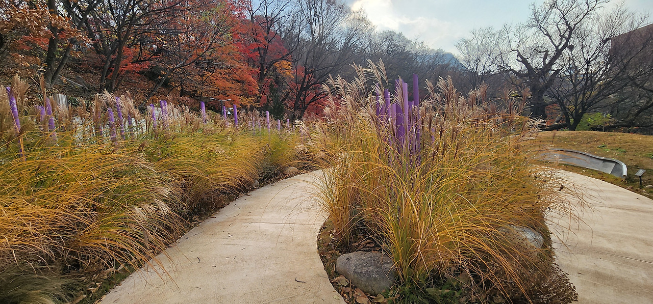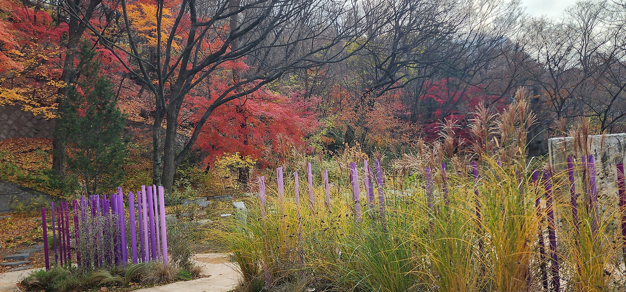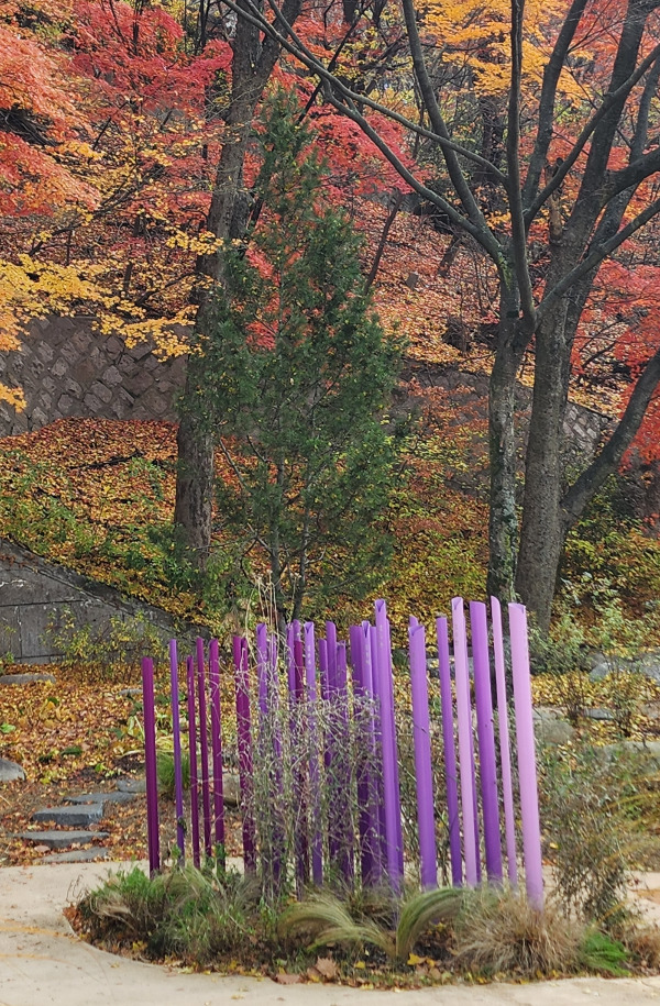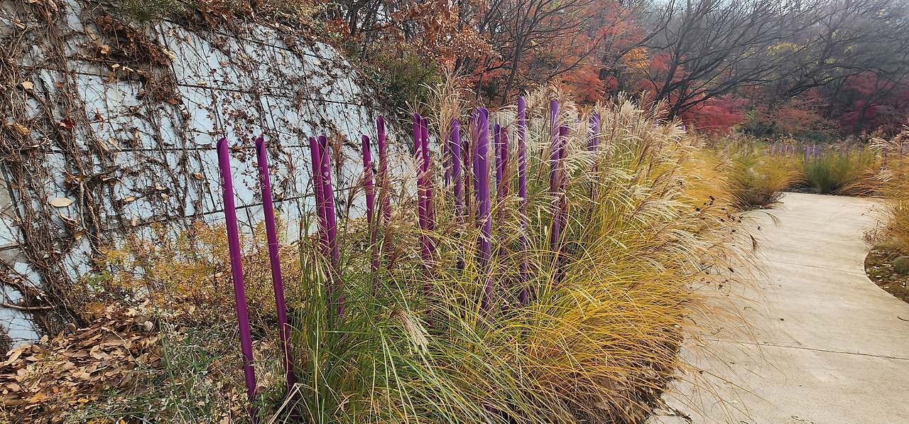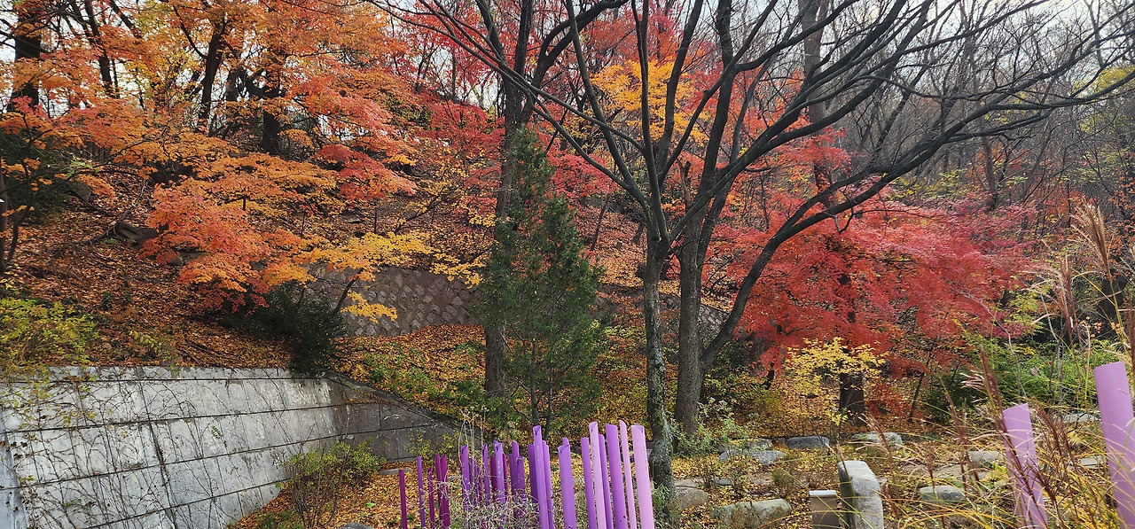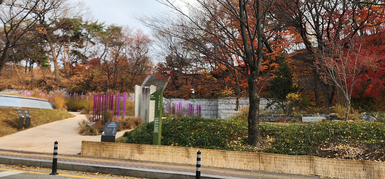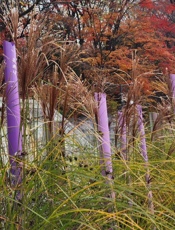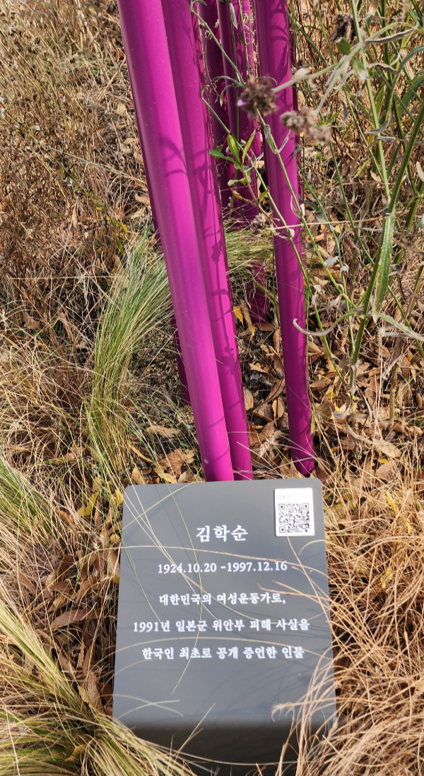 보라색 막대와 갈대, 그리고 아직 시들지 않은 단풍이 어우러져 환상적인 풍경을 만들어냈다. 길옆에는 400년 된 은행나무 보호수가 위안부 할머니들의 아픔을 다 안다는 듯 웅장하게 서서 지켜보고 있다. 왠지 마음이 무겁고 우울해지며 발걸음이 떨어지지 않았다.