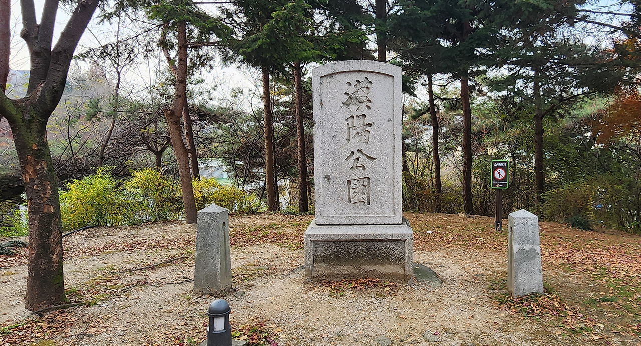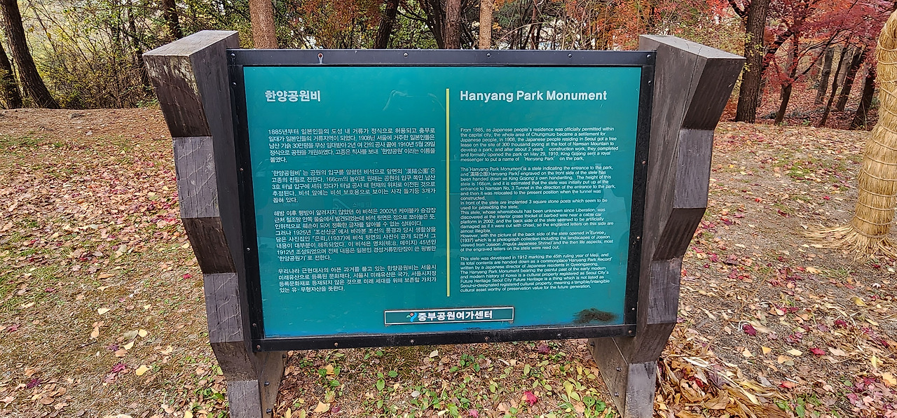 한양공원은 당시 남산 기슭 30만 평을 무상으로 임대해 만들었다. 비석 뒷면은 훼손되었고 앞면의 ‘한양공원’ 글자는 고종의 친필로 알려졌다. 고종은 칙사를 보내 한양공원이라는 이름을 내렸다고 한다. 한양공원 터에서 마지막으로 조선신궁 터를 가기 위해 남산 계단을 올랐다.