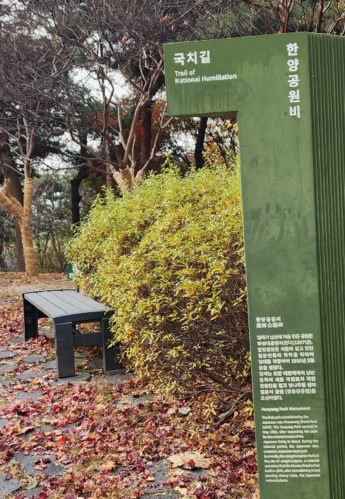 나라의 치욕을 뜻하는 ‘국치(國恥)길’은 서울시가 남산 일대에 조성한 약 1.7km의 역사 탐방로다. 1910년 한·일 강제 병탄(경술국치(庚戌國恥)) 등 아픈 역사를 담은 이 구간을 기억하고 상처를 치유하자는 의미를 담아 지난 2018년에 만들었다.