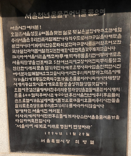차를 마신 뒤 타임캡슐 광장으로 향했다. 1994년 11월 29일, 서울 정도(定都) 600년을 맞이해 만든 타임캡슐을 보기 위해서였다. 보신각종을 본뜬 모양의 타임캡슐에는 정치, 경제, 사회, 문화 등 1994년의 시민 생활과 서울의 모습을 대표할 수 있는 문물 600점을 담아 원형 판석 지하 15미터 지점에 묻었다.