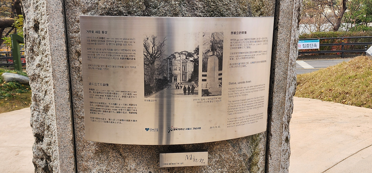 중앙에는 남작 하야시 곤스케 군상을 거꾸로 박아 놓은 ‘거꾸로 세운 동상’이 있다. 하야시 곤스케는 고종 황제와 대신들을 겁박하여 을사늑약을 강요한 장본인이다. 일제는 그 공으로 그에게 남작 작위를 내리고 이곳에 동상을 세웠다. 그런데 2015년 광복 70주년을 맞아 곤스케의 동상 잔해를 모아 거꾸로 세웠다. 동상 이름은 남작하야시곤스케군상(男爵林權助君像)이다.