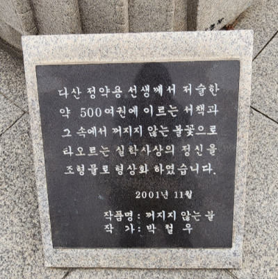 기념관을 나오면 너른 마당에 정약용 동상이 서 있고 선생의 위패와 영정을 모신 사당 문도사와 묘지로 올라가는 계단이 보인다.