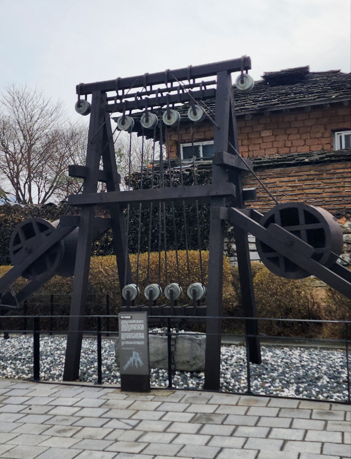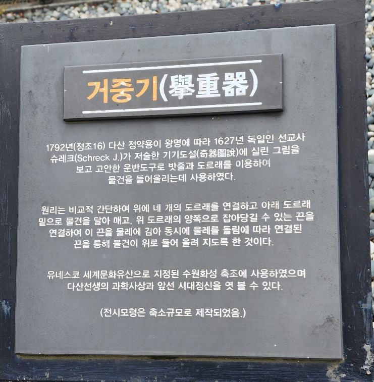 작은 도서관에서 나오면 바로 건너편에 실학박물관이 있다. 그리고 여유당 권역과 박물관 사이 거리에 볼거리가 많았다. 그중 가장 눈에 띄는 것은 거중기다. 수원화성을 지을 때 1등 공신 역할을 했던 거중기는 정약용 선생이 만들어낸 조선의 과학 작품이다. 이 거중기로 10년을 계획했던 수원화성 건설 기간이 2년 9개월로 단축되었다고 한다.