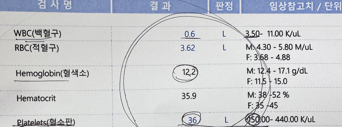 백혈구가 3.5인데 0.6이네? 좀 정상이 아니네 정도로 생각했고 혈소판은 근데.. 150에 36이면 이것도 좀 낮구나? 했는데 산부인과 선생님이 매우 당황한 표정이었다.